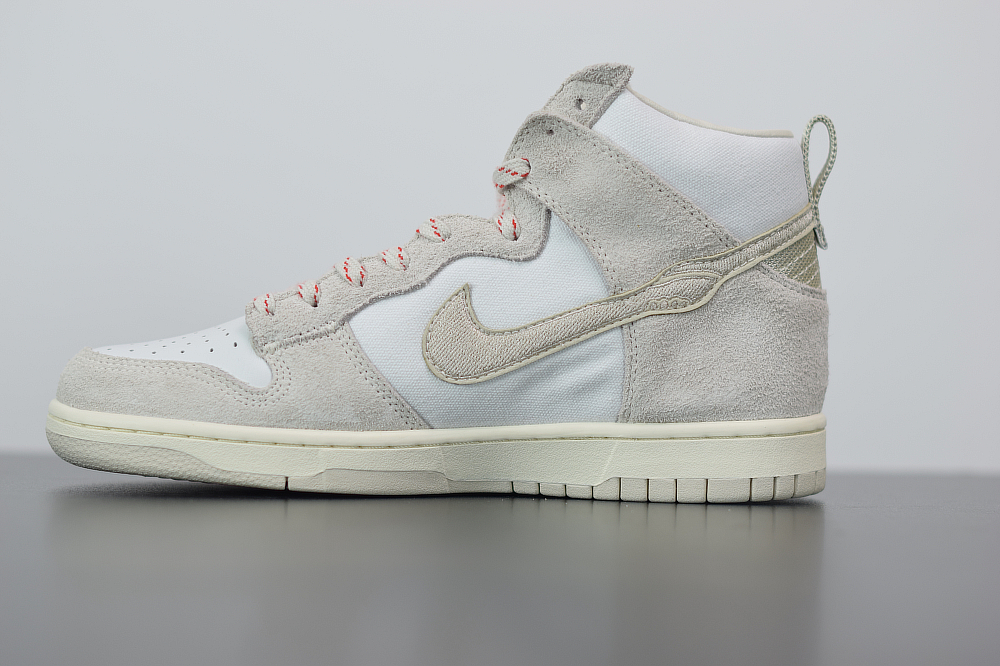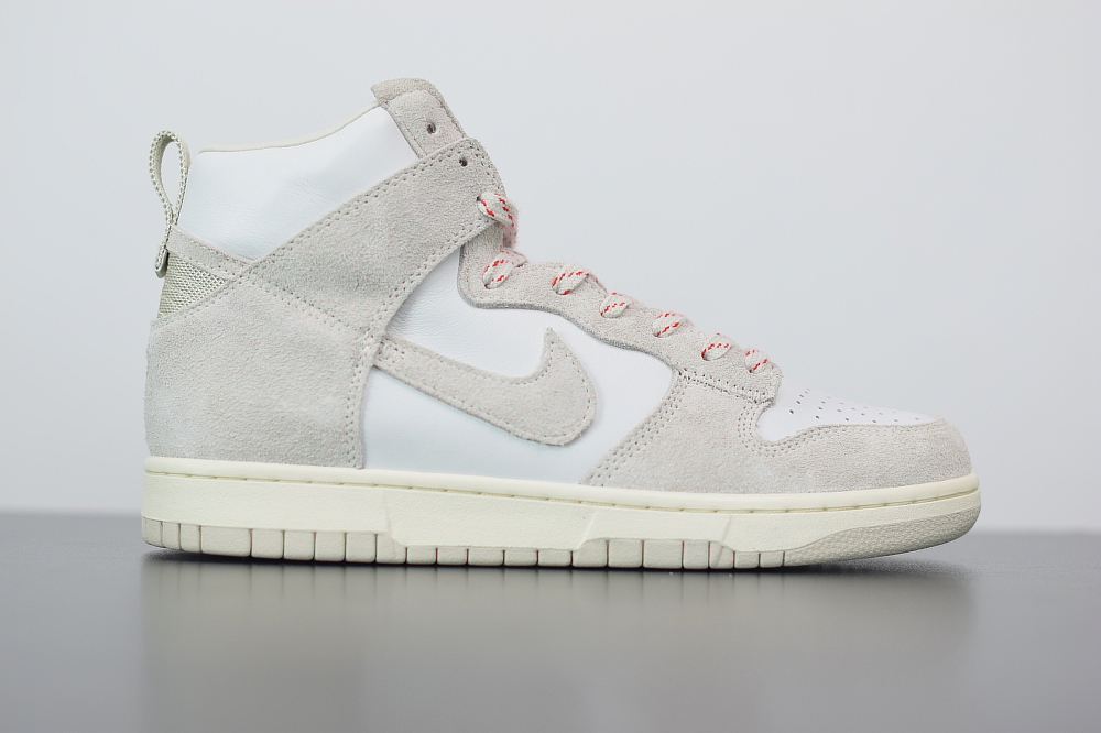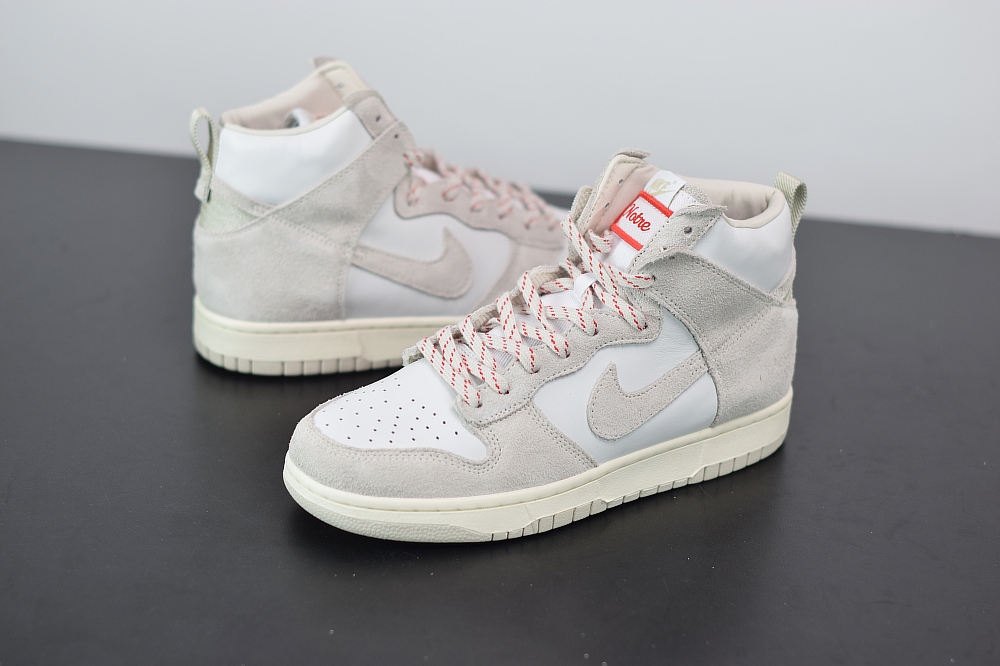 Built of white leather and shaggy “Light Orewood Brown” suede, the uppers present a classic, workmanlike look. This is given a dash of vibrance by the orewood laces’ red flecks and a rectangular white/red Notre badge embroidered directly onto the tongue, partially covering the standard Nike tag and giving off a mechanic shirt-style look.