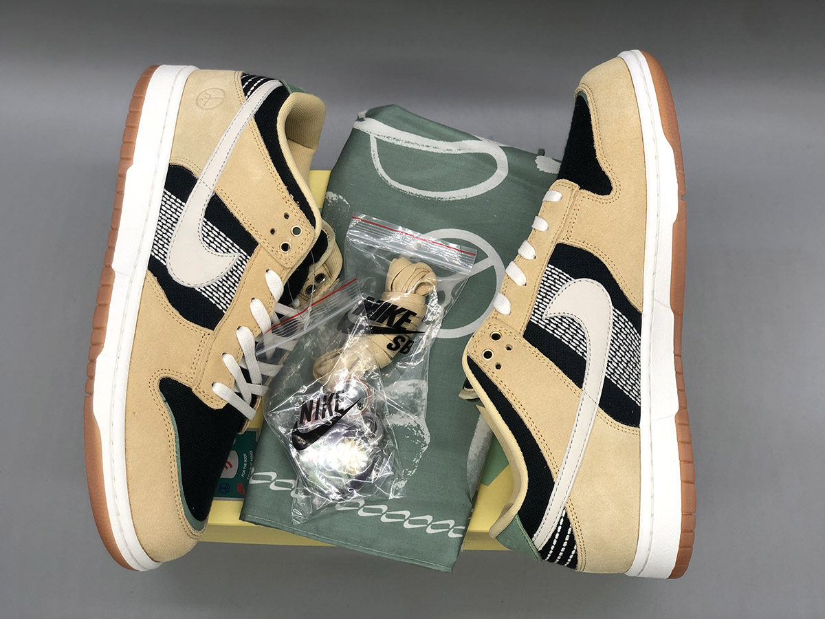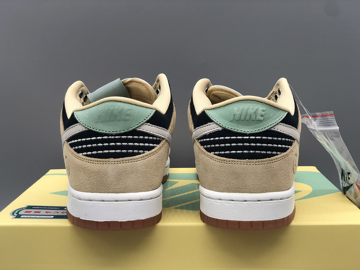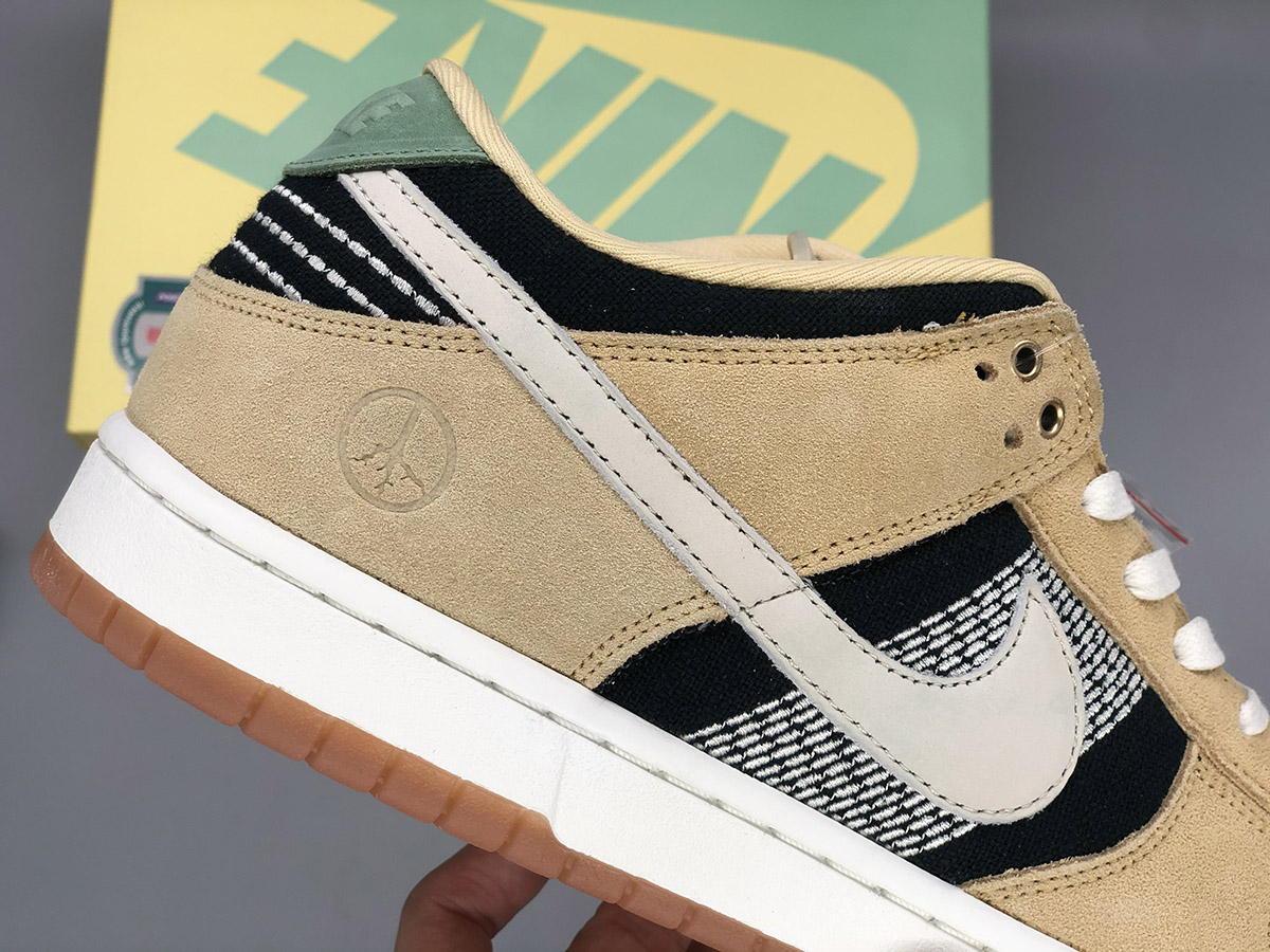 This Nike Dunk Low comes dressed in a Pale Vanilla, Sail, Black, and Silver Pine color combination. Constructed with Black denim across the upper while White Sashiko-like stitching hits the panels and heel. Next, Beige suede lands on the overlays, White leather covers the Swoosh logos, and Pine Green on the tongue labels, heel, and insoles. Sticking out, we have a peace symbol with roots on the lateral side by the heel.