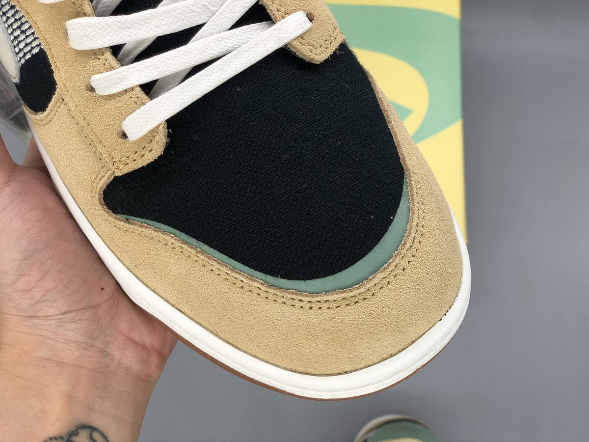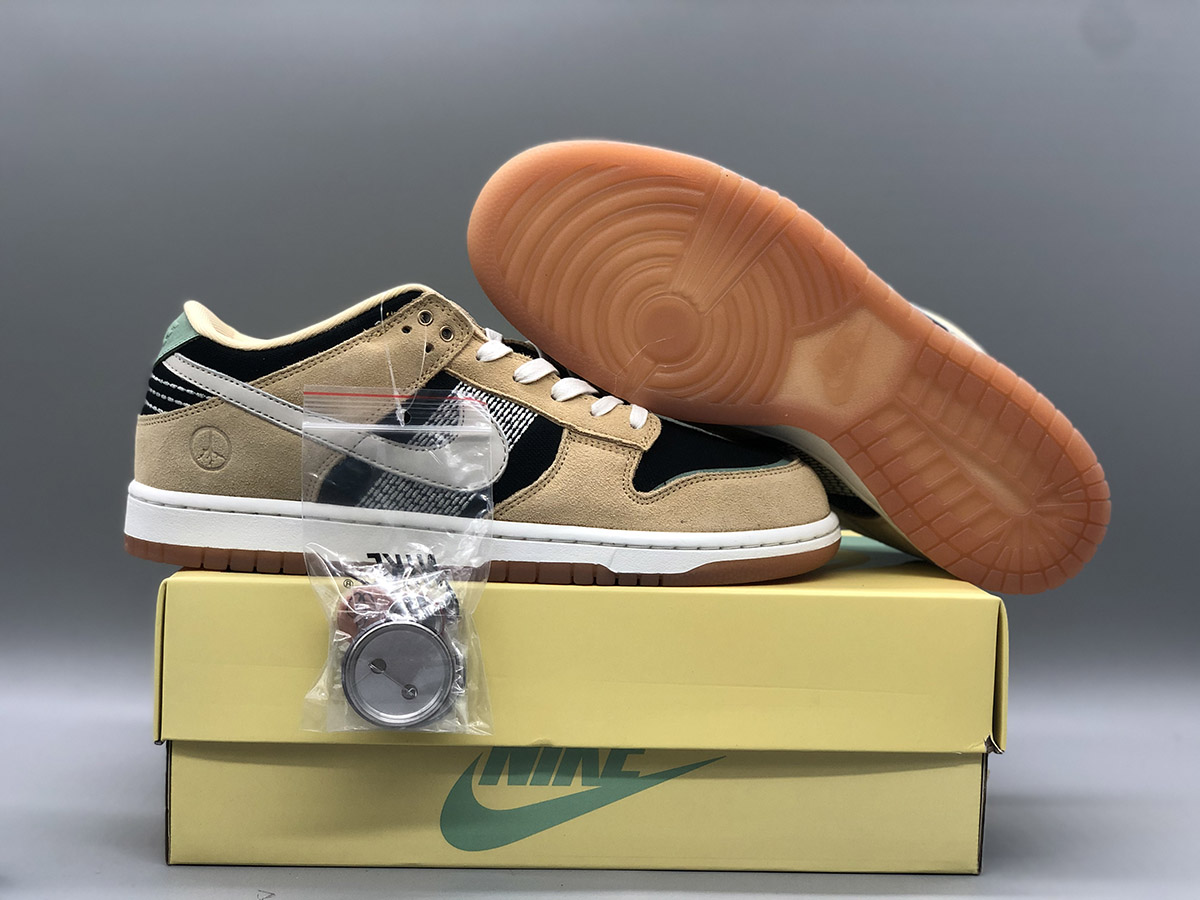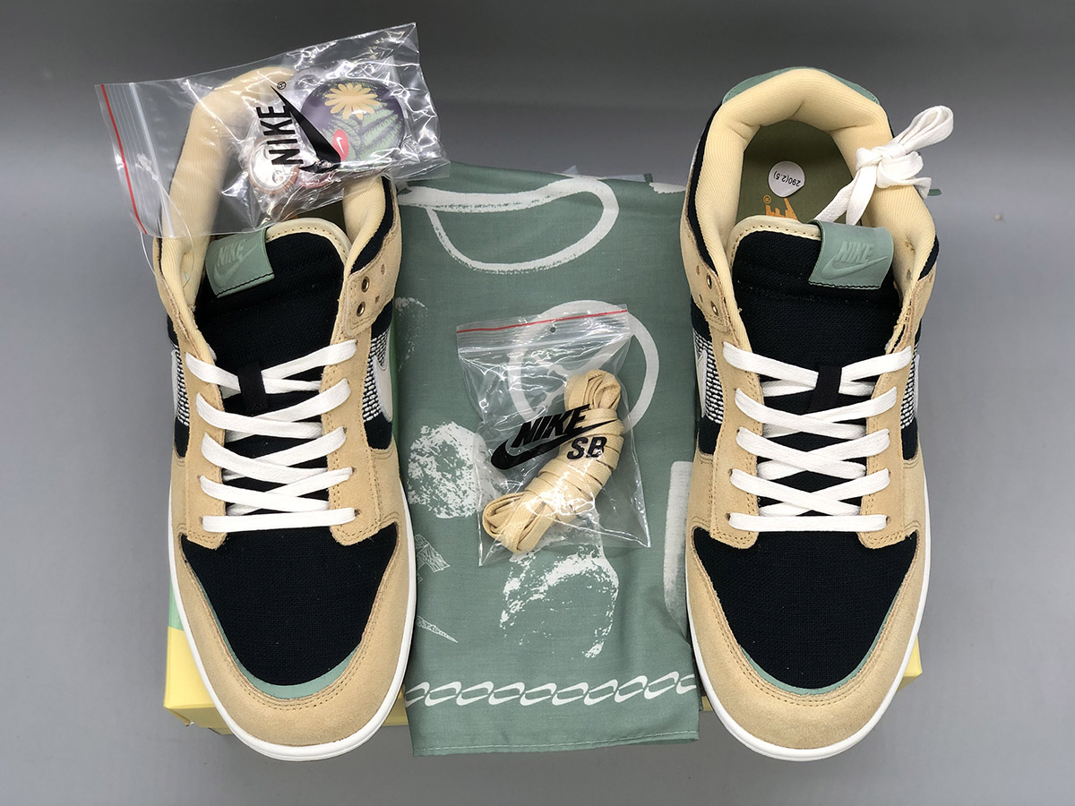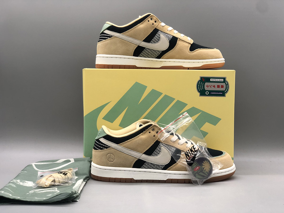 This Nike Dunk Low comes dressed in a Pale Vanilla, Sail, Black, and Silver Pine color combination. Constructed with Black denim across the upper while White Sashiko-like stitching hits the panels and heel. Next, Beige suede lands on the overlays, White leather covers the Swoosh logos, and Pine Green on the tongue labels, heel, and insoles. Sticking out, we have a peace symbol with roots on the lateral side by the heel.