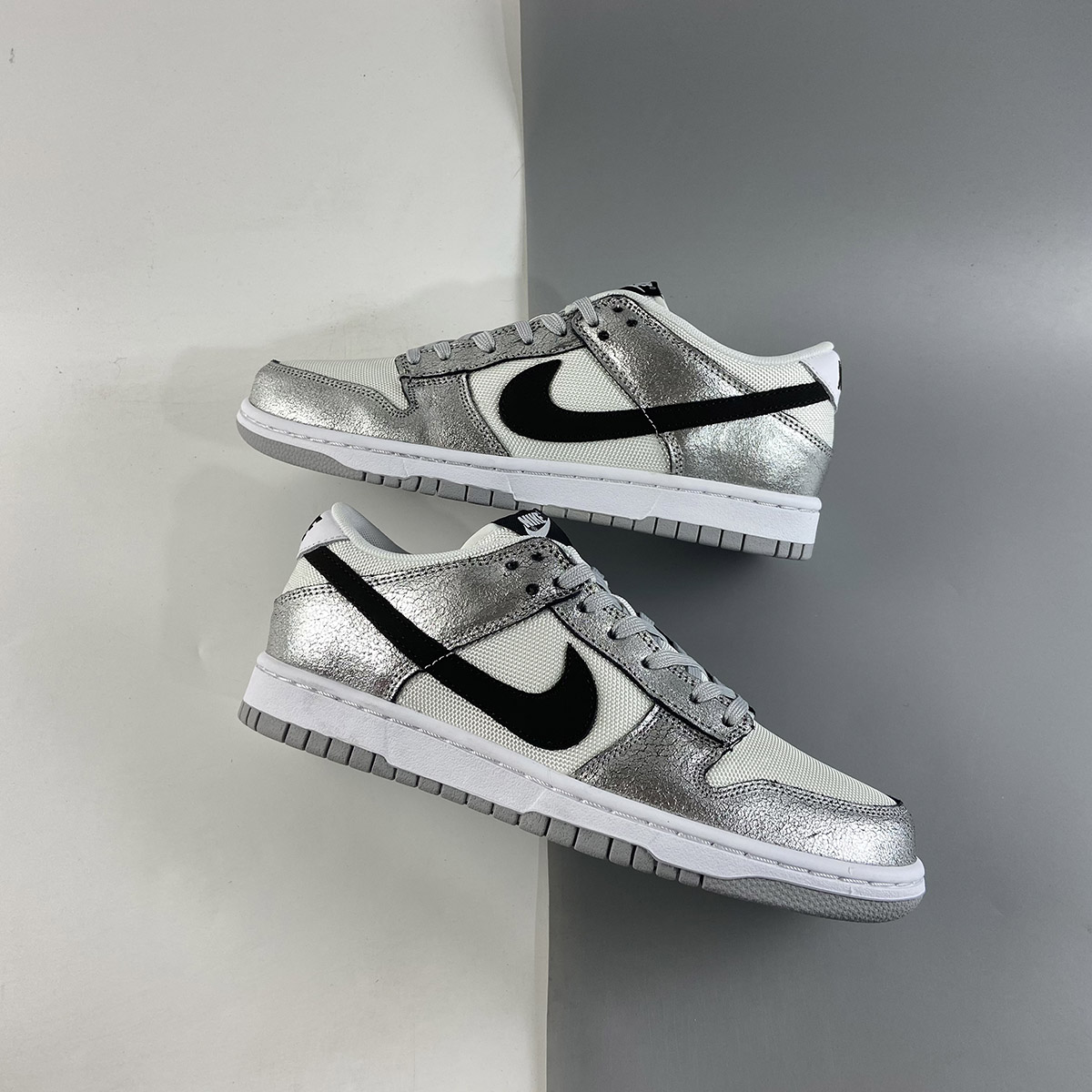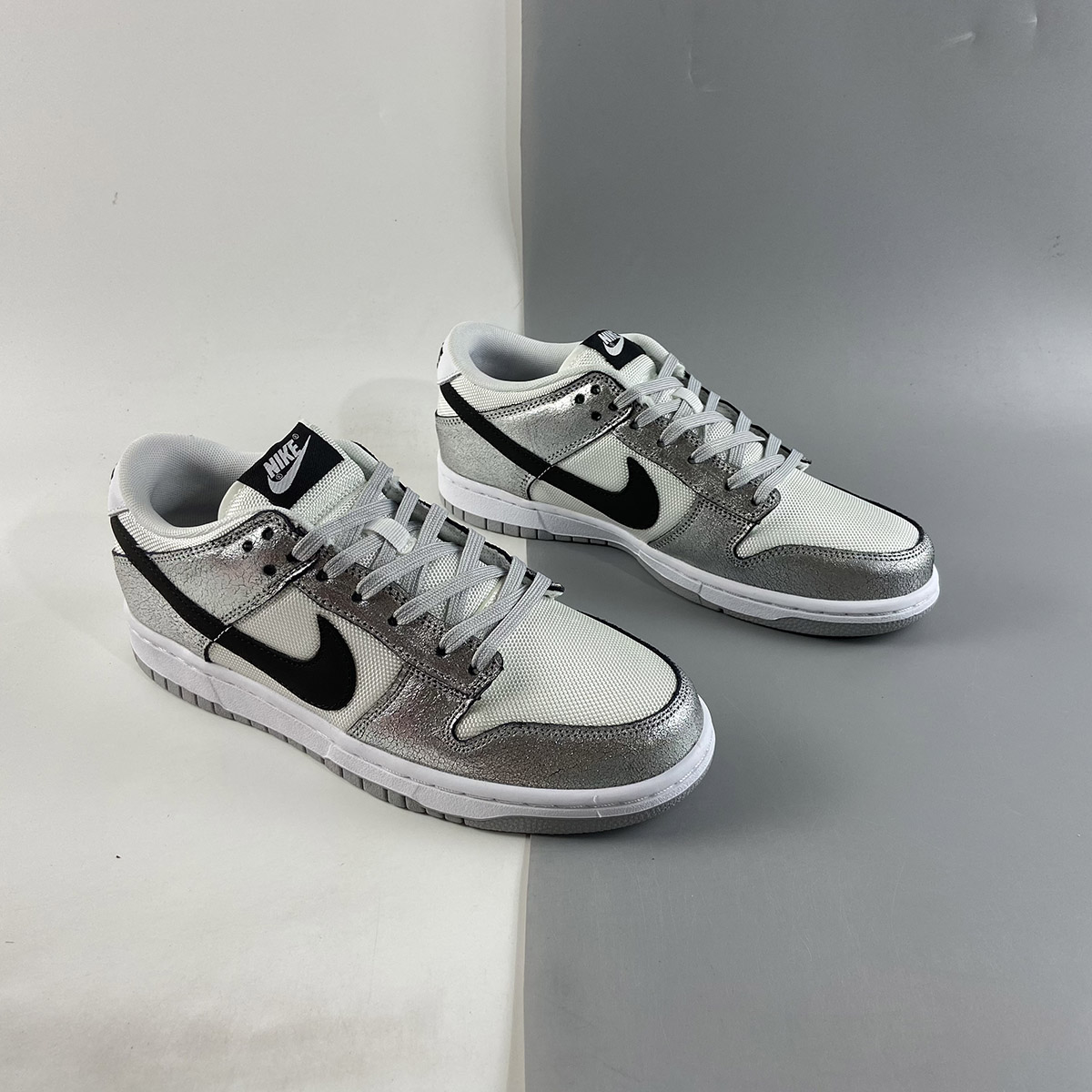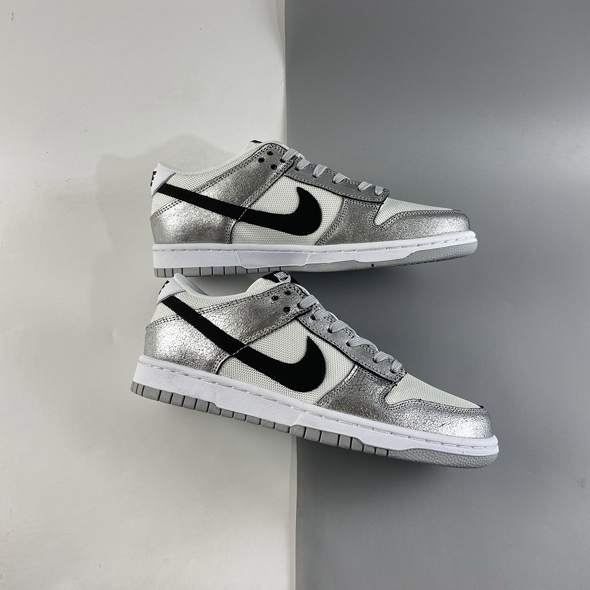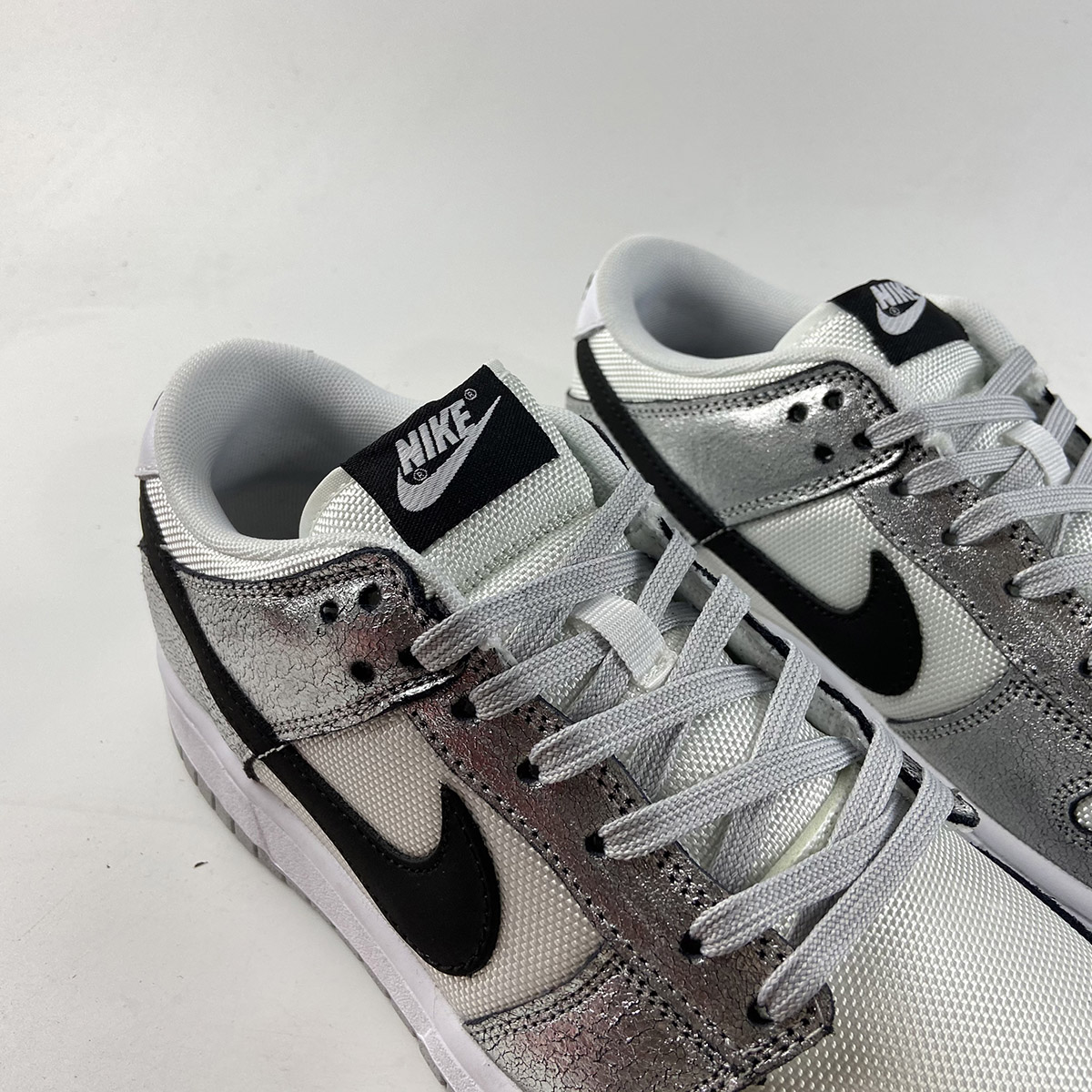 This offering of the Nike Dunk Low features a White mesh upper with Metallic Silver cracked leather overlays. Black detailing appears on the Swooshes, tongue and heel branding and insole while having Grey laces and rubber soles atop a White midsole to complete the design.