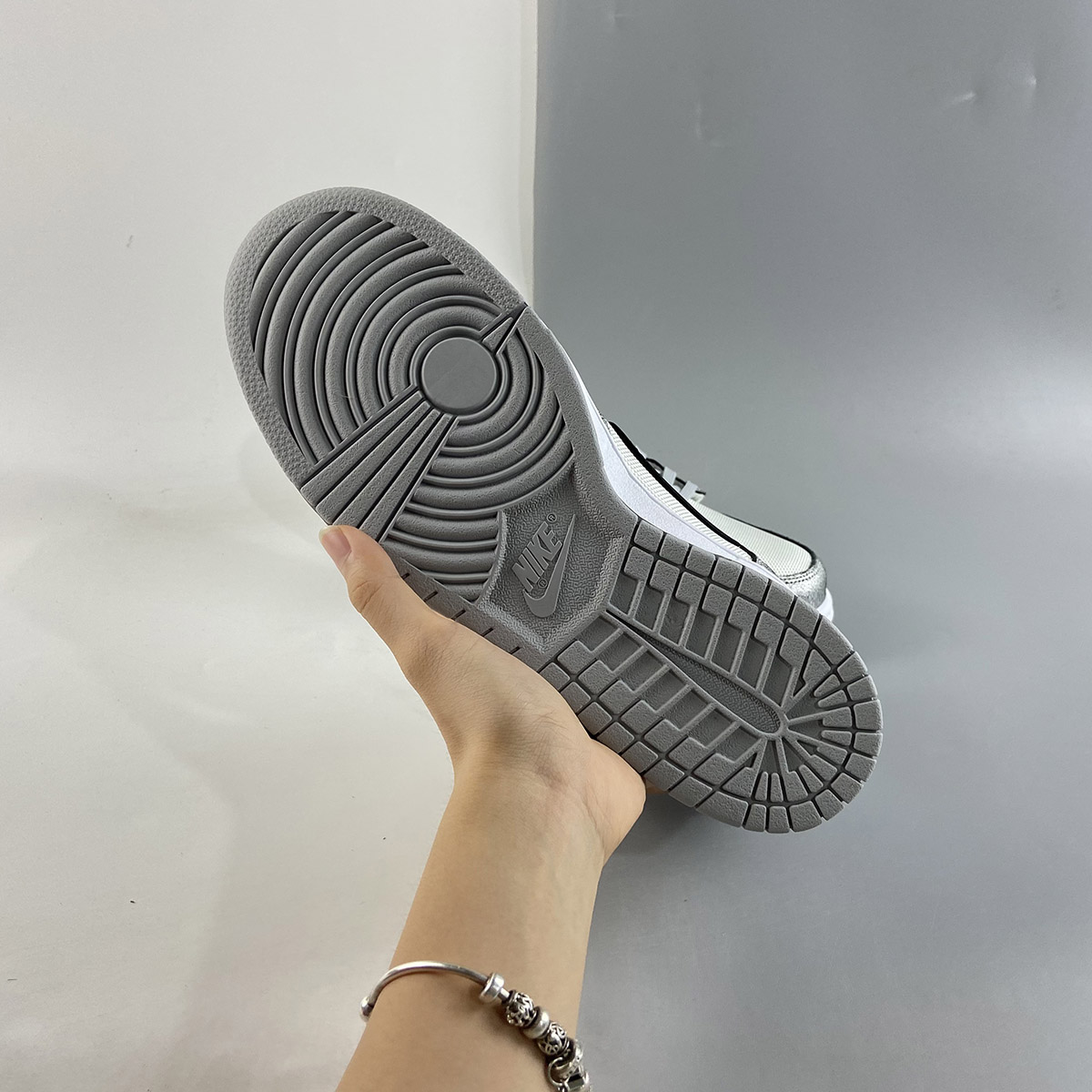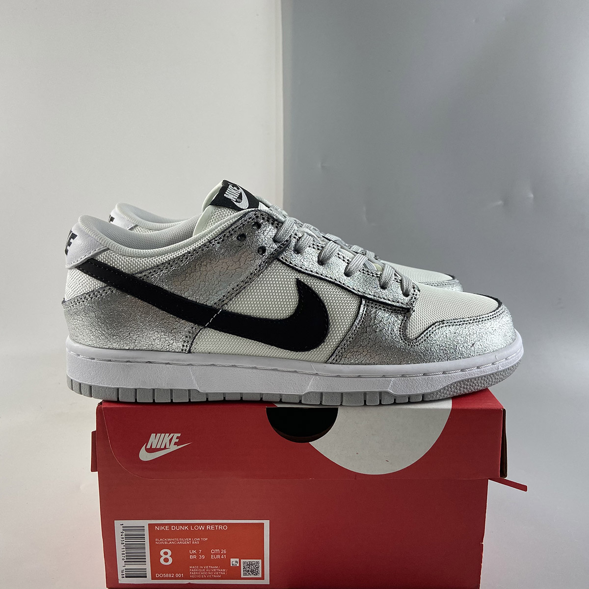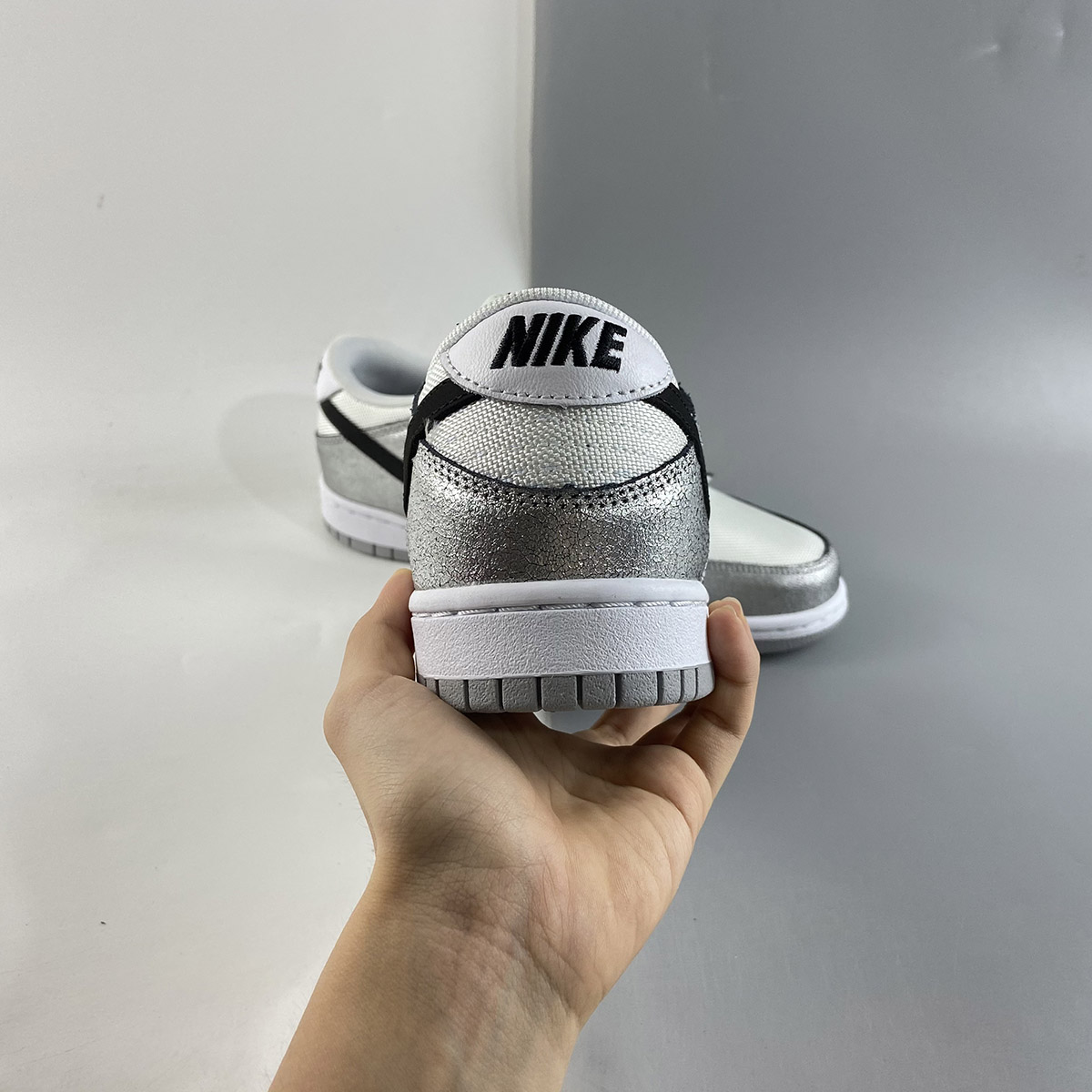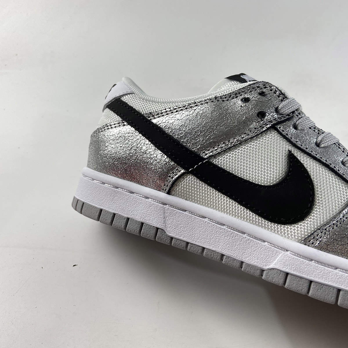 This offering of the Nike Dunk Low features a White mesh upper with Metallic Silver cracked leather overlays. Black detailing appears on the Swooshes, tongue and heel branding and insole while having Grey laces and rubber soles atop a White midsole to complete the design.