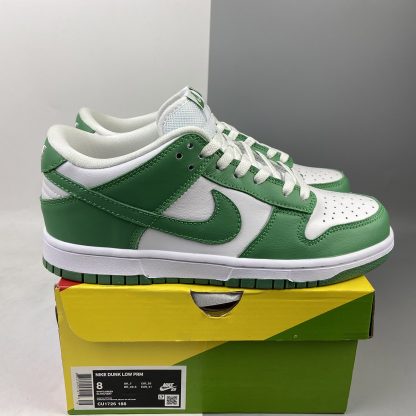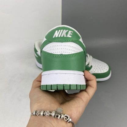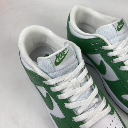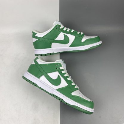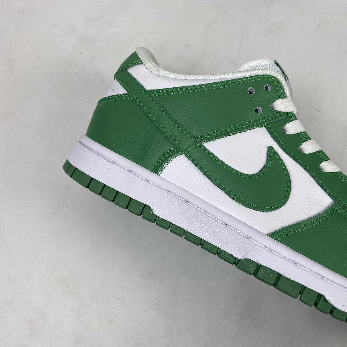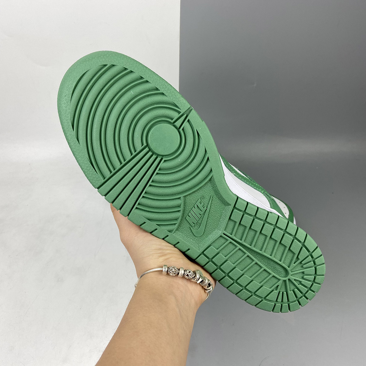 This offering of the Nike Dunk Low features a White leather base with Green Glow overlays, Swoosh logos and rubber outsole. White continues on the inner lining, laces, and midsole to complete the design.