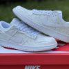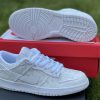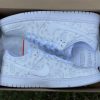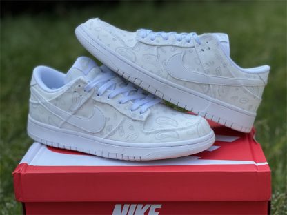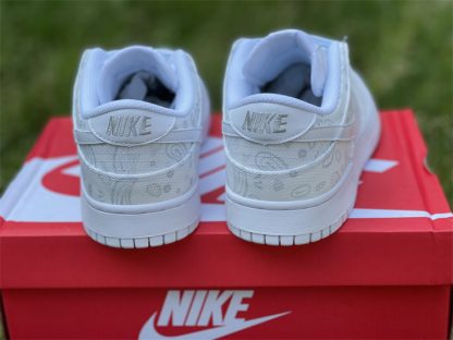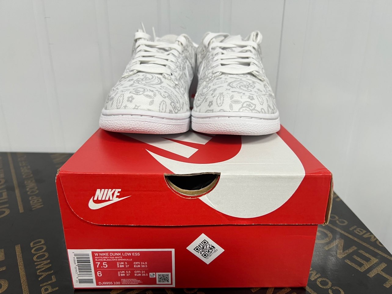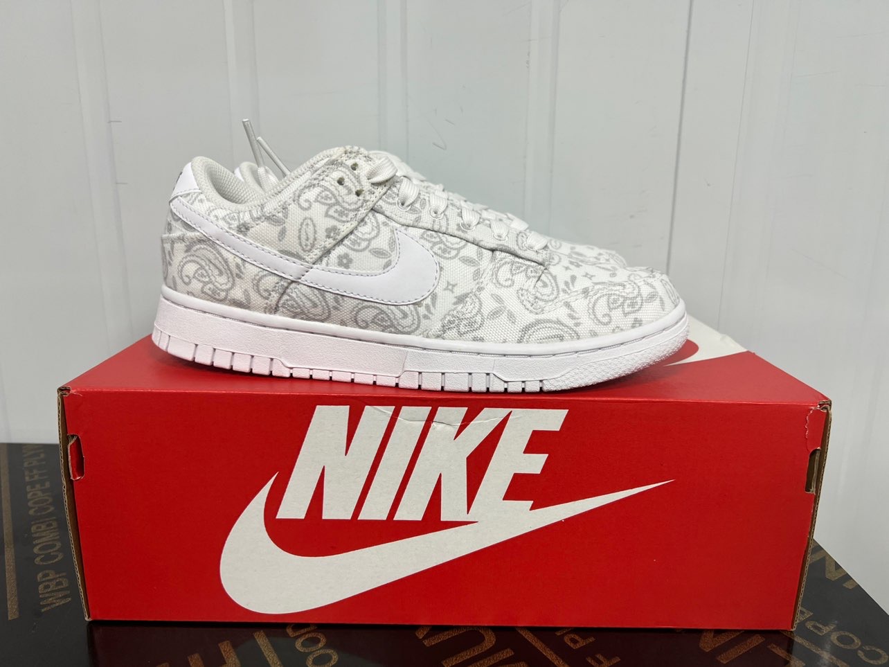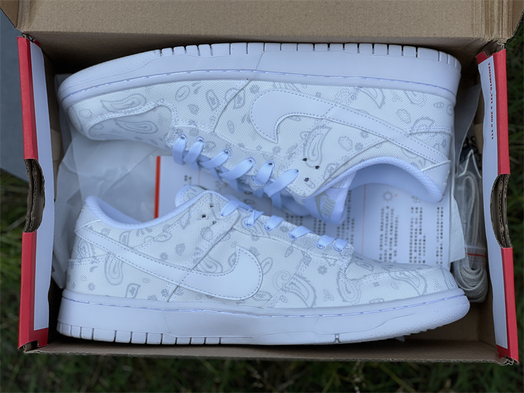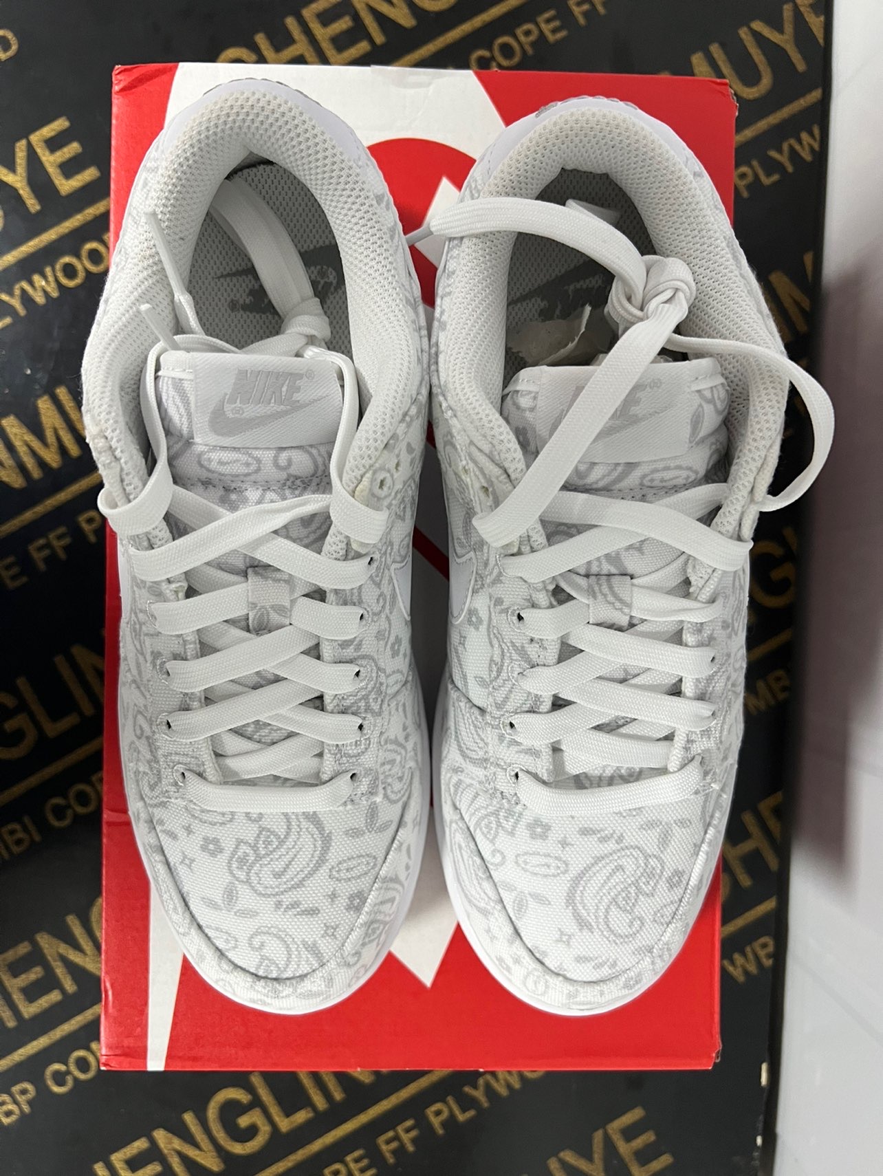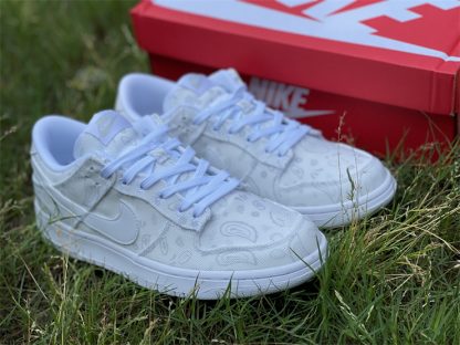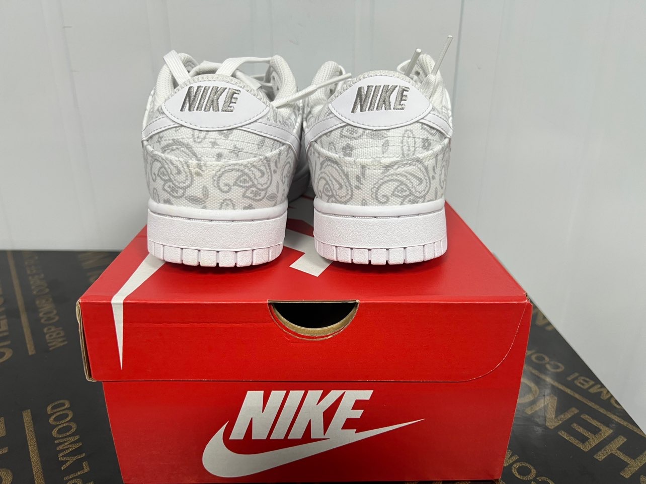 Composed in a subtle, light grey shade, the iconic pattern is layered atop the shoe’s canvas base. But as it features Swooshes all throughout and a slightly modified design, the paisley appears quite different from its traditional counterpart, though that is difficult to discern at a quick, faraway glance. Elsewhere, the side check, heel tab, midsole, and laces are outfitted in a solid white finish, while the adjacent branding — such as the “Nike” embroidery and tongue label — opt for a silver coloring.
