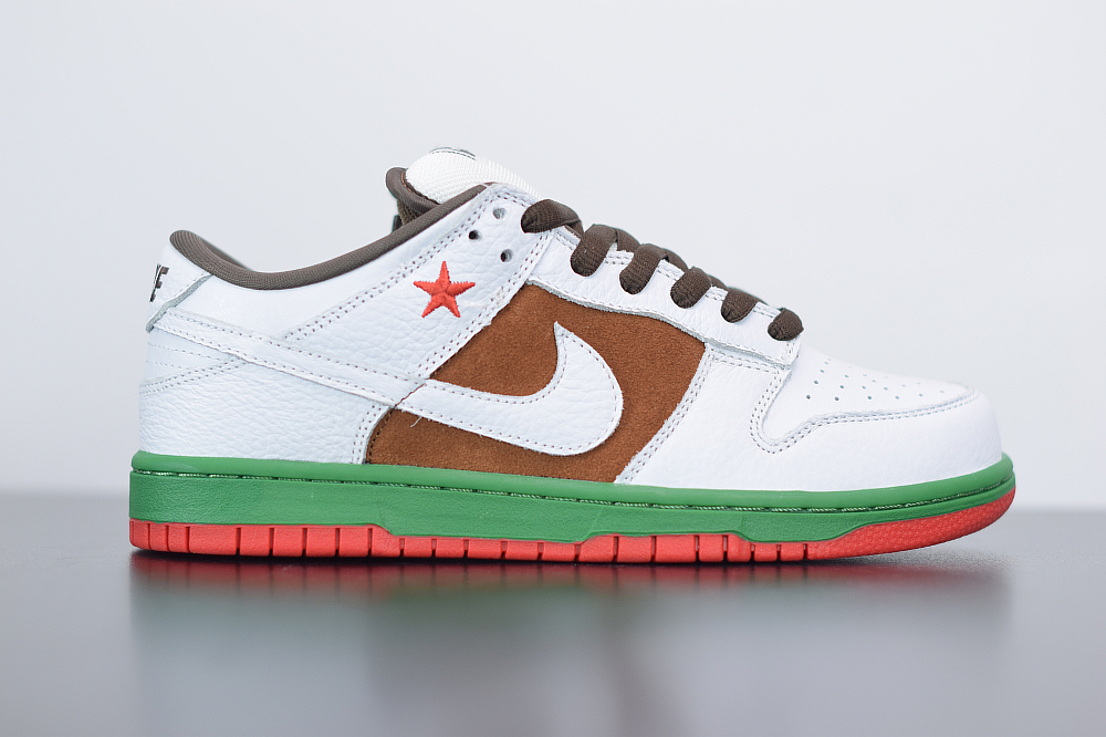 These Dunks were inspired by the California state flag, hence the nickname Cali.  They shoes have a brown suede side panel, representing the bear, while the green midsole resembles the grass upon which the bear is standing.  The red outsole is for the red stripe at the bottom of the flag.