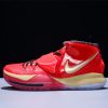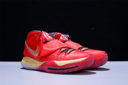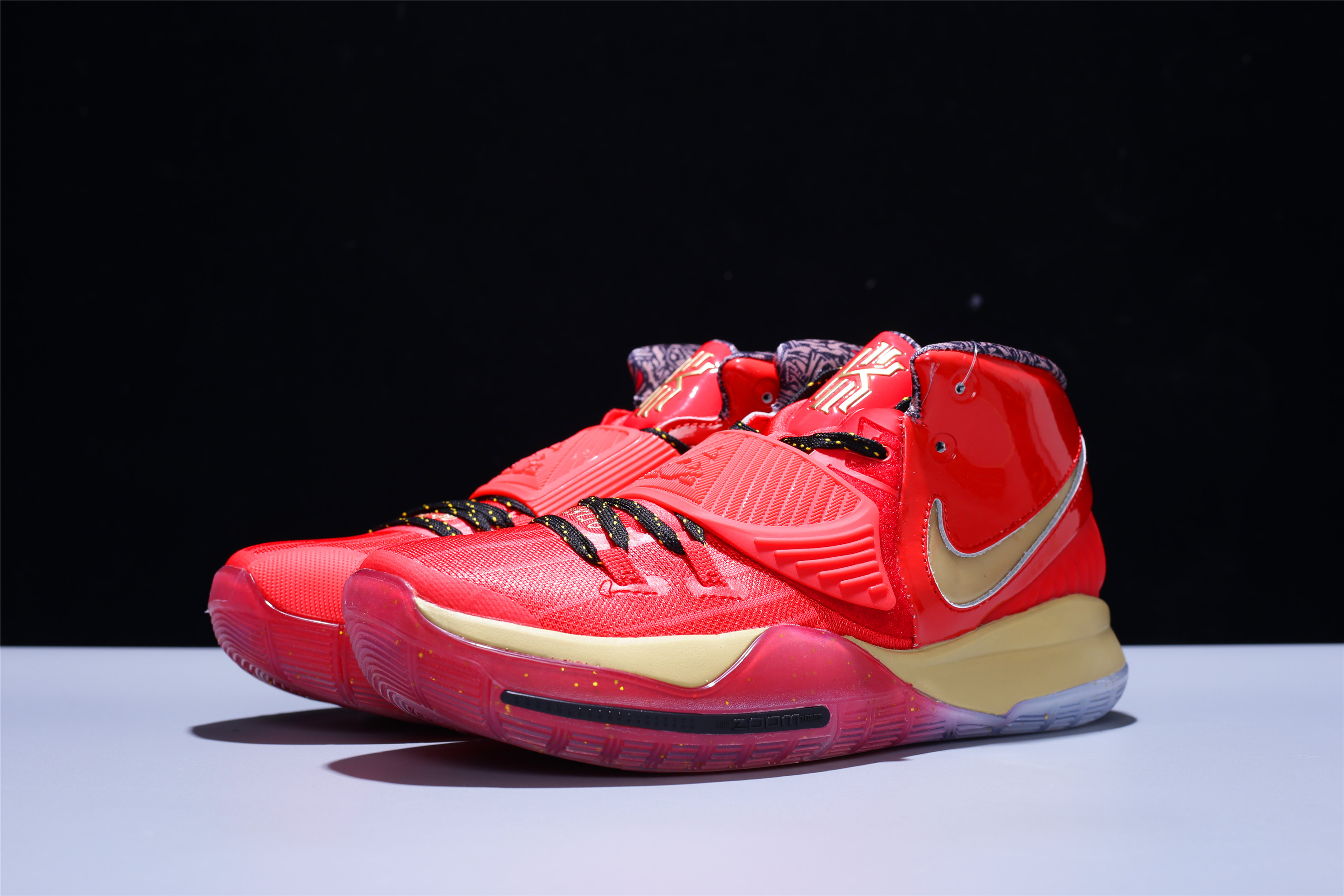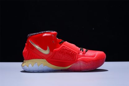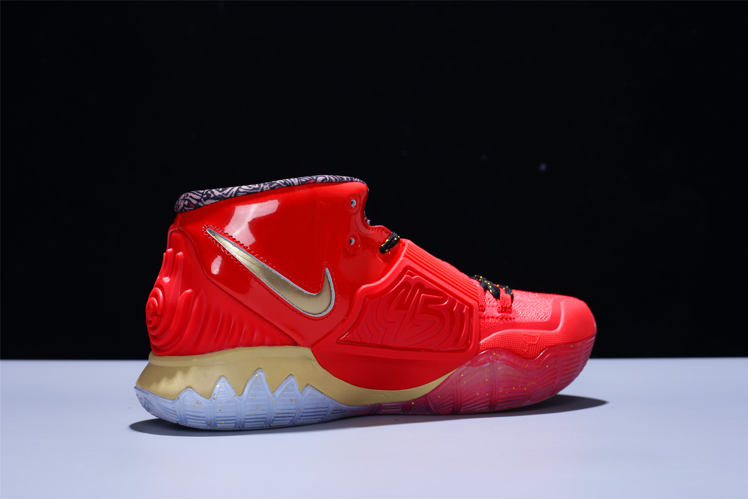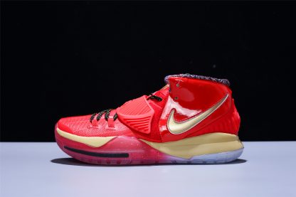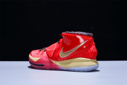 This offering of the Nike Kyrie 6 features a Red base paired with Gold and Black detailing throughout atop a speckled translucent outsole. Other details includes “06/16/96” text on the lower tongue of the right shoe and “06/19/16” on the left nodding to Irving’s only NBA Championship. Completing the design is a graphic inner lining pattern resembling the carpet that MJ laid on crying after winning his first NBA title after losing his father.