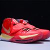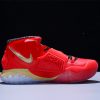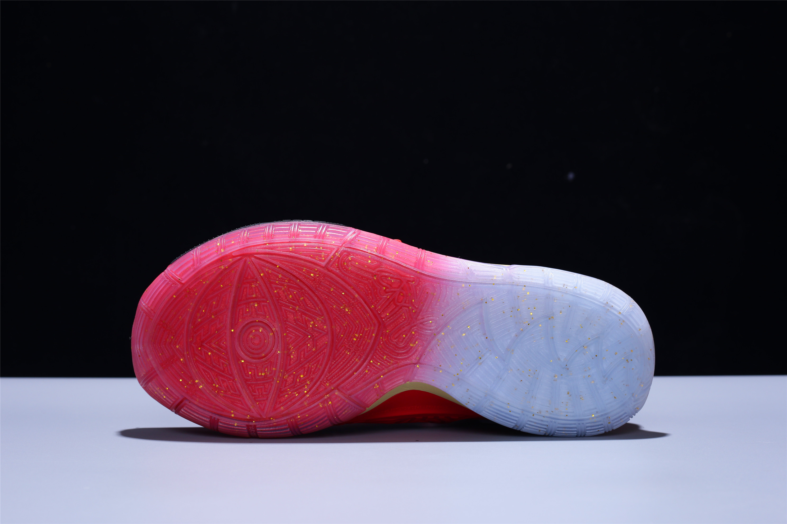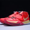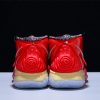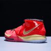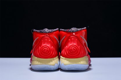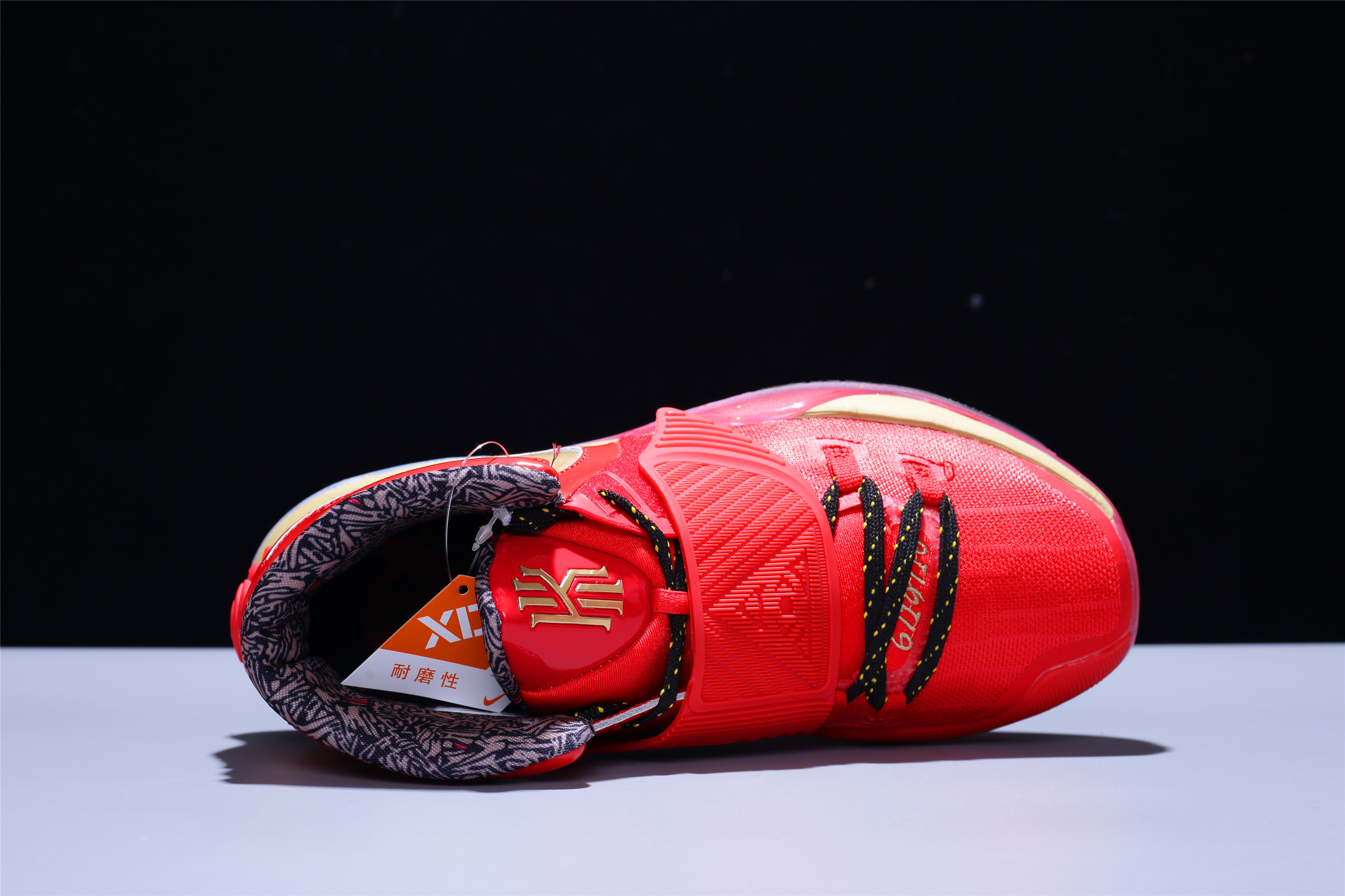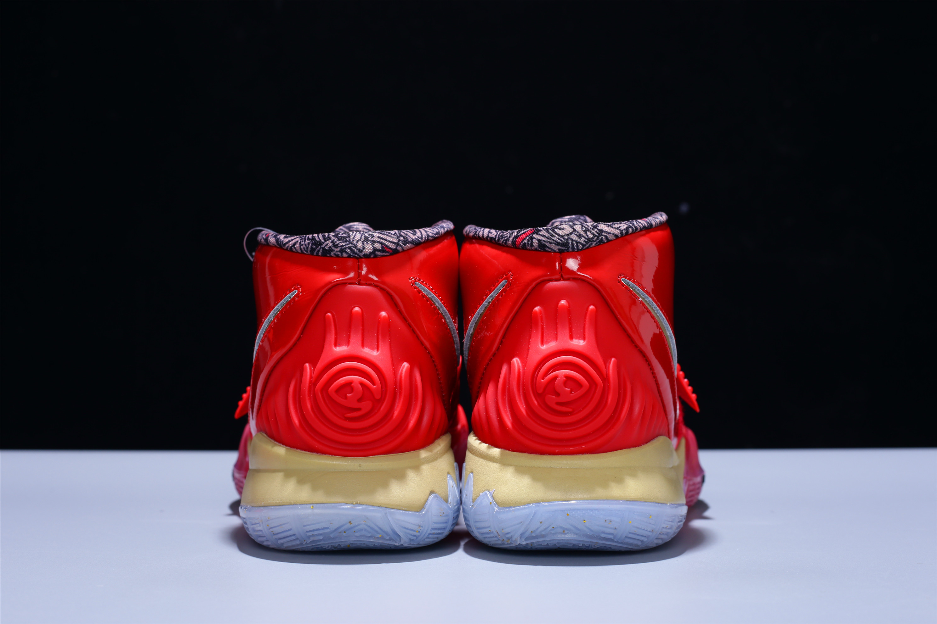 This offering of the Nike Kyrie 6 features a Red base paired with Gold and Black detailing throughout atop a speckled translucent outsole. Other details includes “06/16/96” text on the lower tongue of the right shoe and “06/19/16” on the left nodding to Irving’s only NBA Championship. Completing the design is a graphic inner lining pattern resembling the carpet that MJ laid on crying after winning his first NBA title after losing his father.