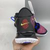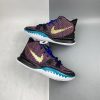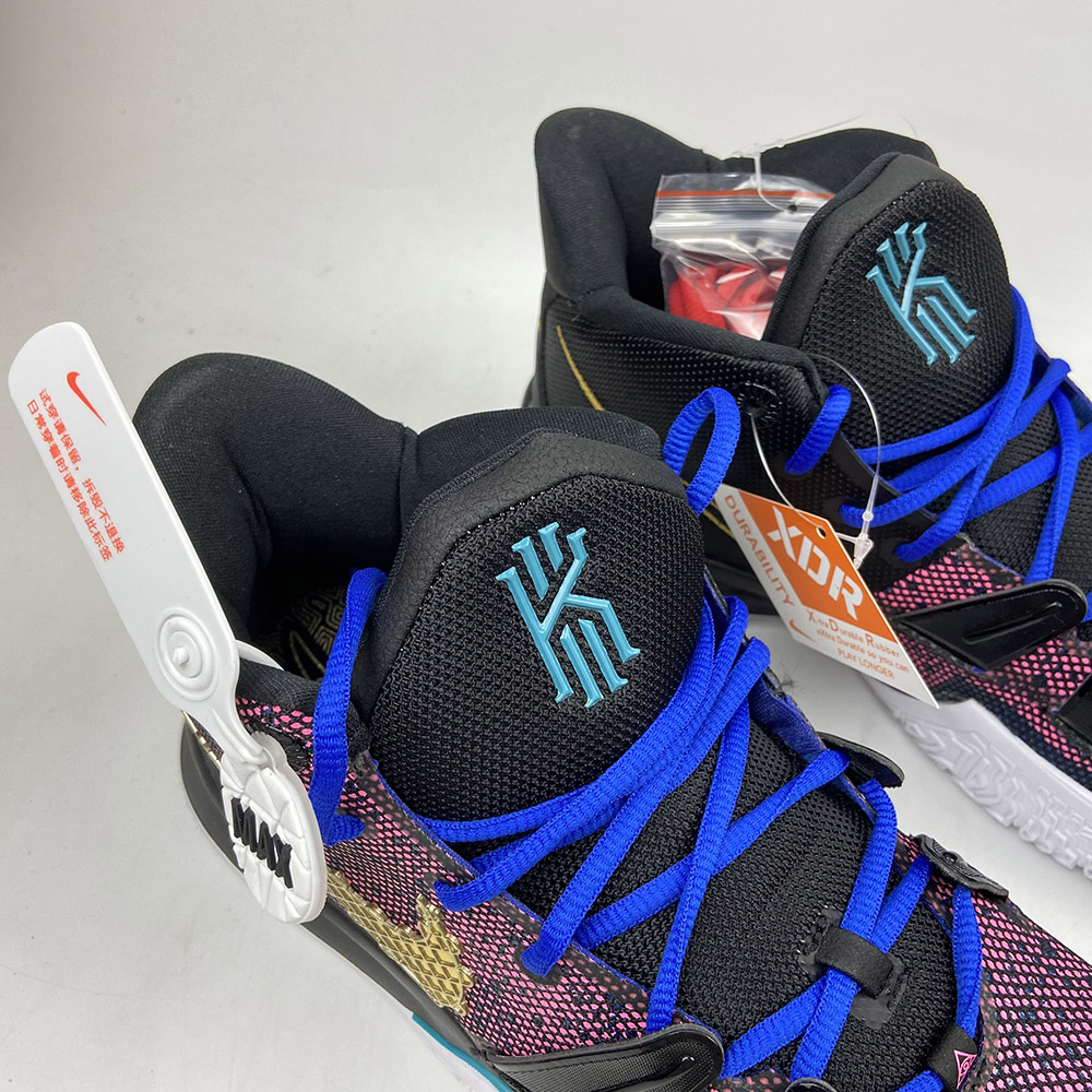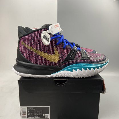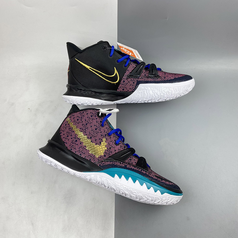This offering of the Nike Kyrie 7 features a Pink printed upper paired with Blue laces and Teal tongue branding and lateral forefoot overlays on the White midsole. Highlighting the shoe is a Gold sculpted ornate-like Swoosh logo on the lateral with embroidery branding appearing on the heels. A White rubber sole with a bold Red Kyrie logo completes the design.