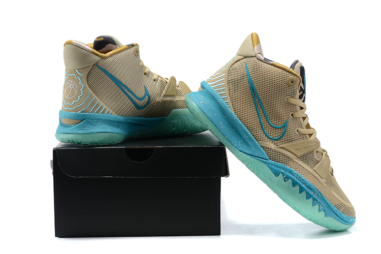 This offering of the Nike Kyrie 7 features a Tan-colored base highlighted with Aquamarine contrasting accents throughout including its speckled midsole and translucent outsole. Camouflage print appears on the tongues and lining while having embroidered heels to complete the design.
