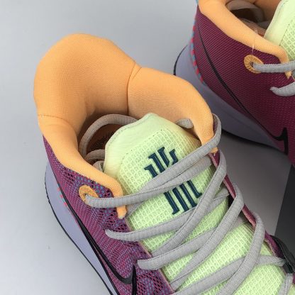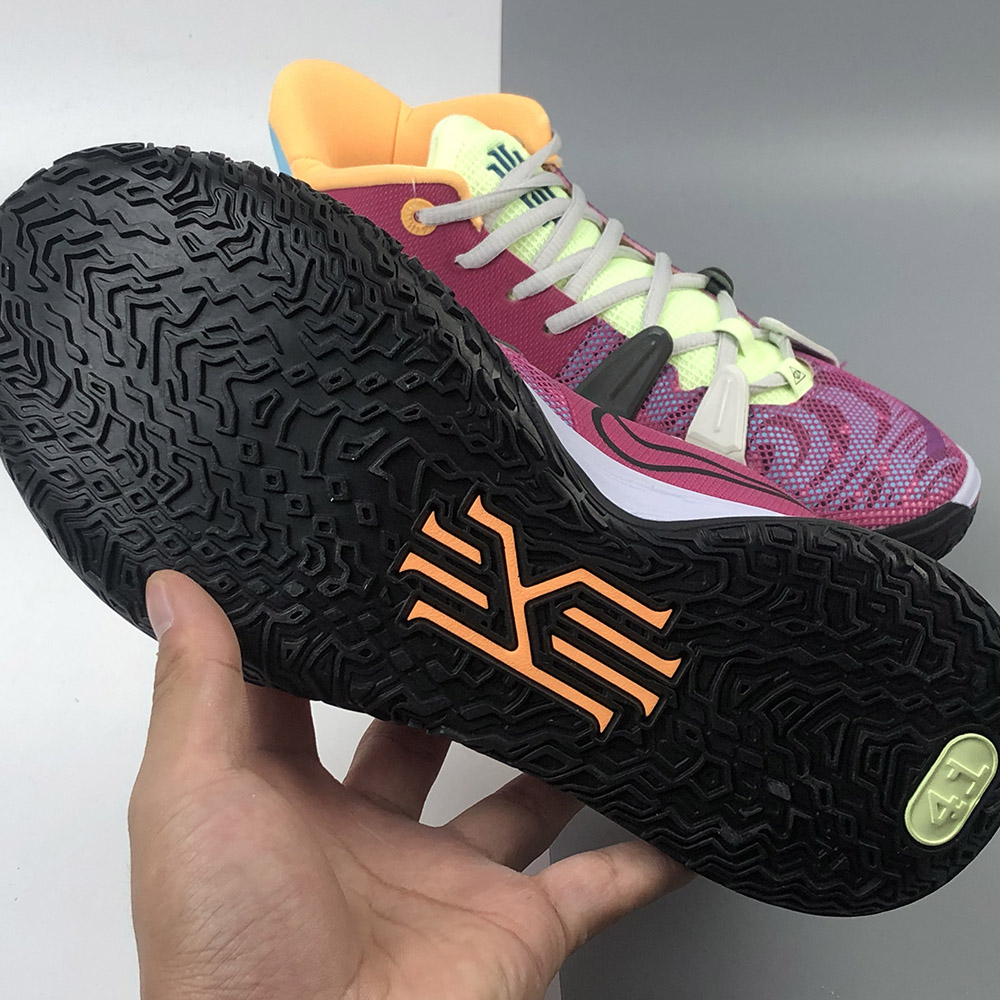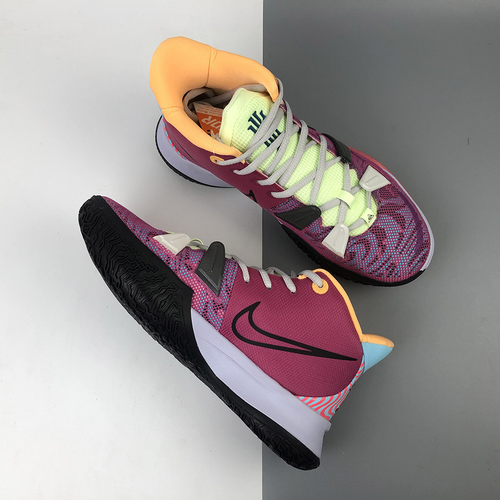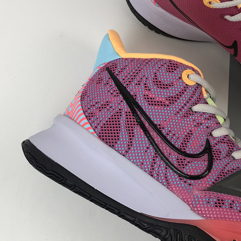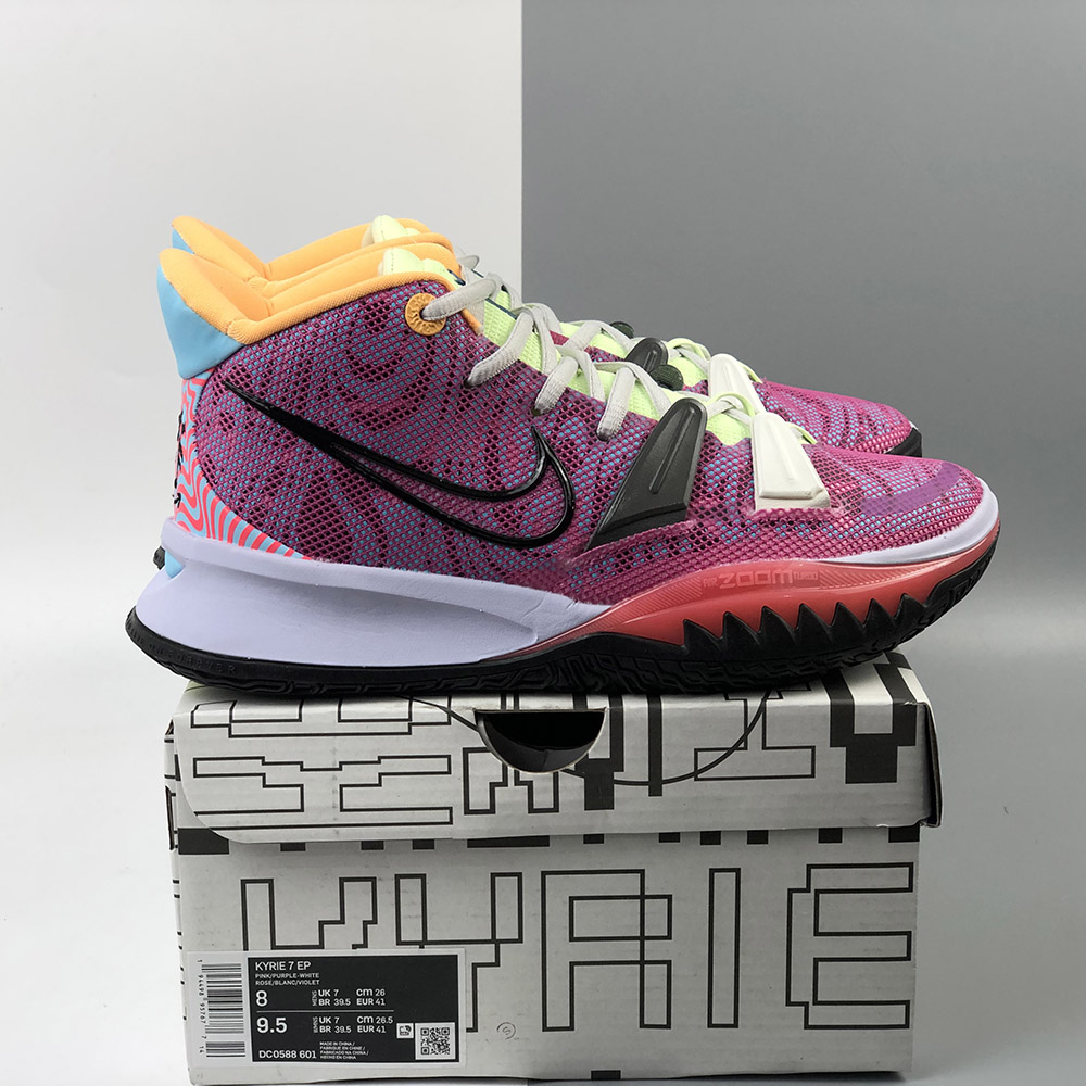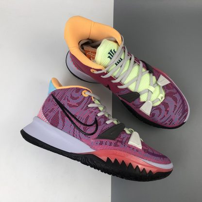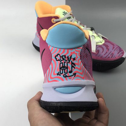 This Nike Kyrie 7 features a psychedelic pattern across the upper which comes with Purple shade while bright colors land on the tongue, top eyelet, liner and top of the heel. Following we have Black outlining the Swoosh logo while musical and street art is seen on the heels to finish the look.