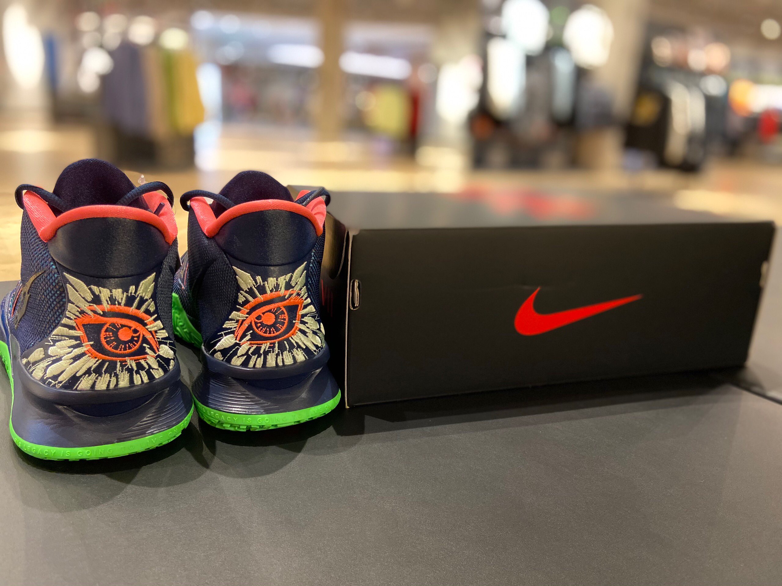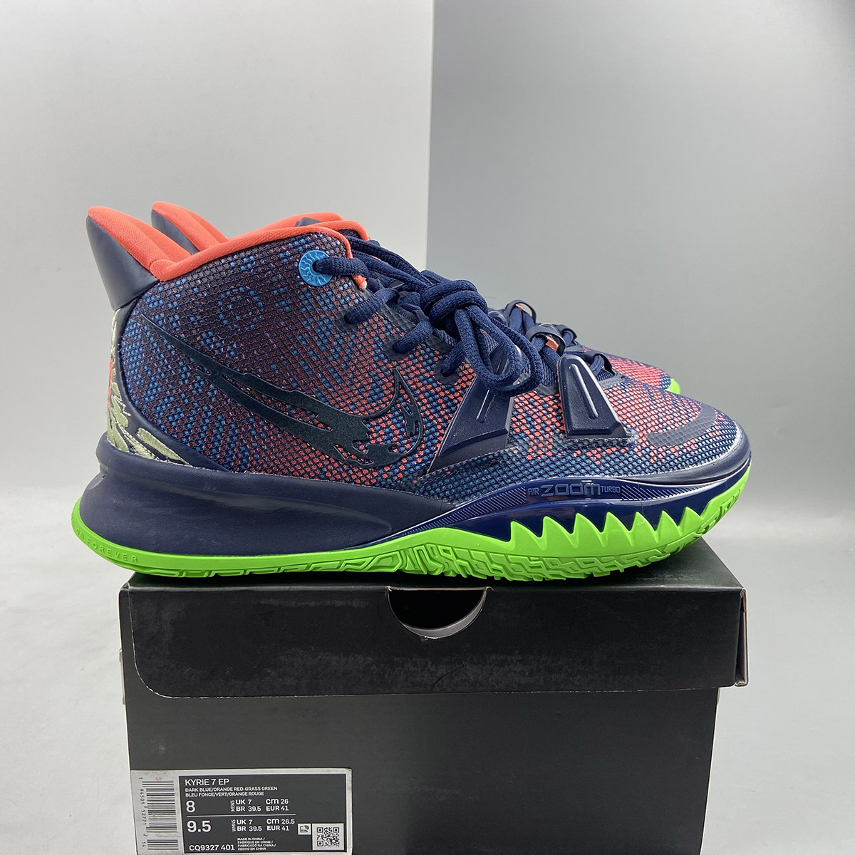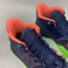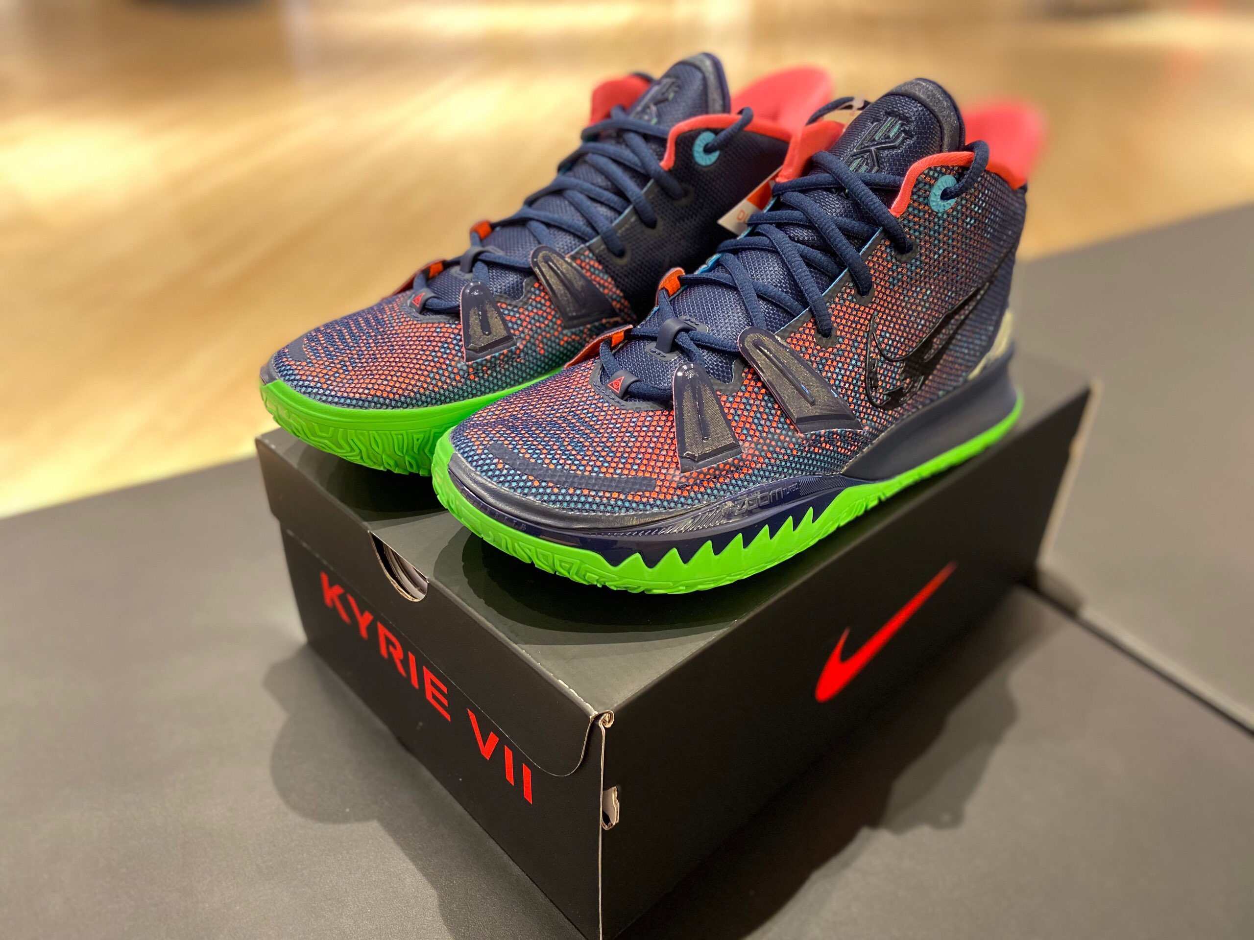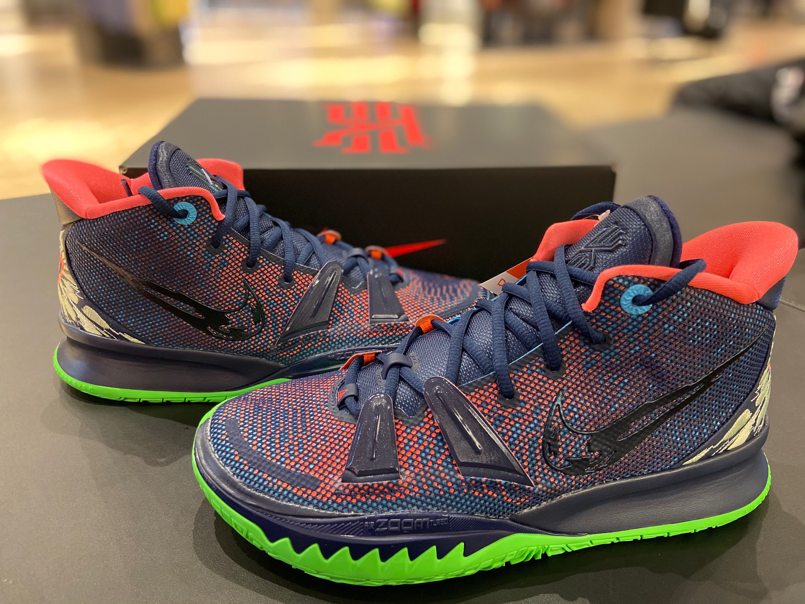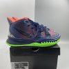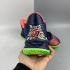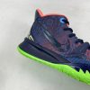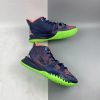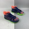 This offering of the Nike Kyrie 7 features a predominately Navy upper highlighted with vibrant Pink and Green contrasting accents. A fragmented Swoosh on the lateral with the models signature embroidered eyes on the heels atop a solid bright Green rubber outsole completes the design.