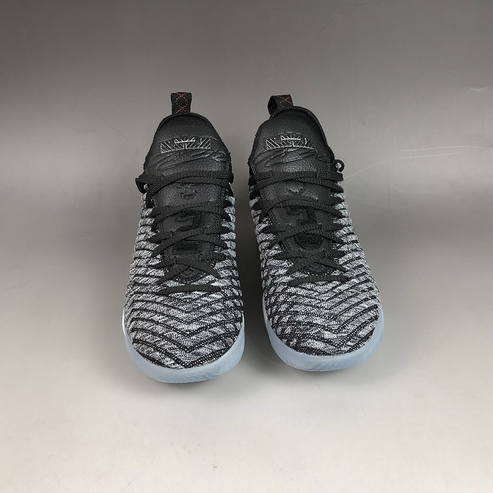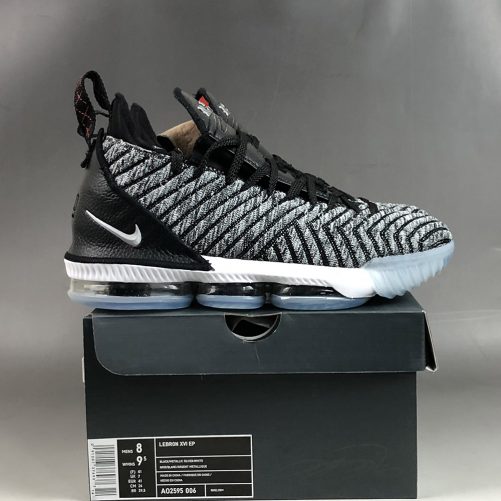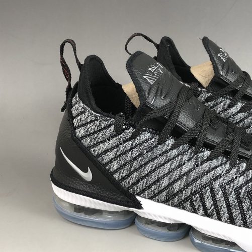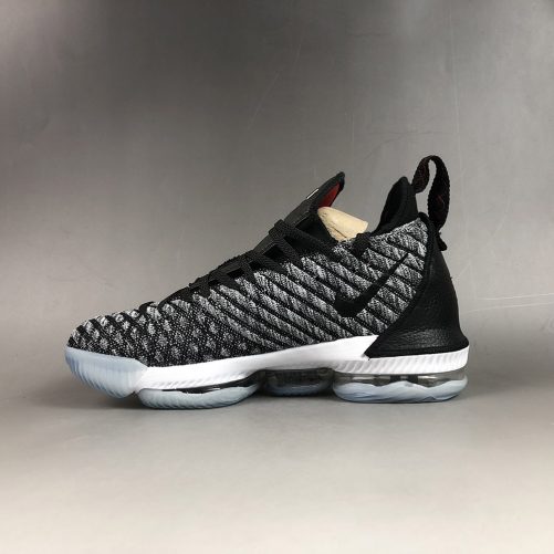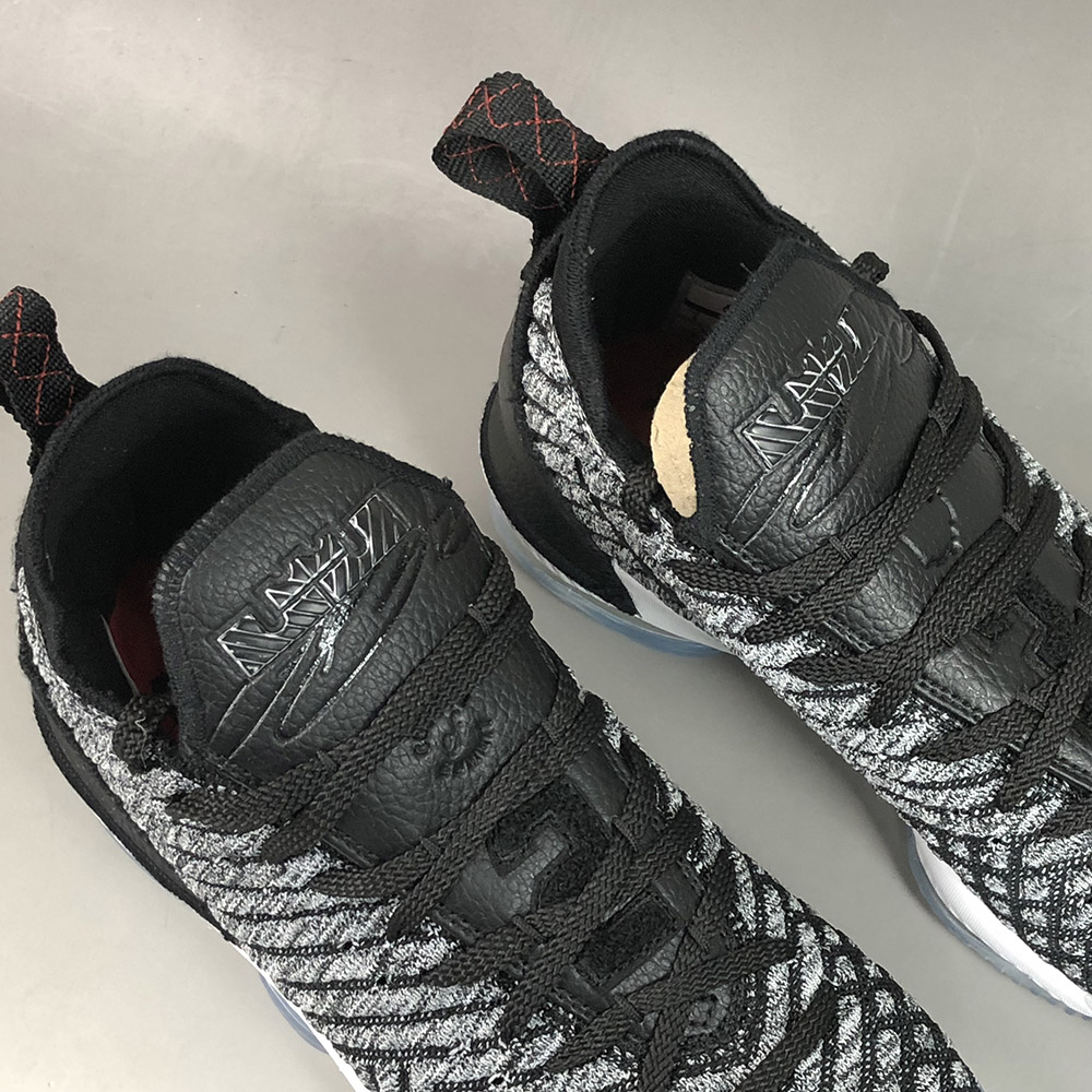 Dressed in a Black and White color scheme. This Nike LeBron 16 features an Oreo-like BattleKnit 2.0 upper, with Black leather on the tongue and heel. Red contrasting accents throughout completed with a White midsole and translucent outsole.