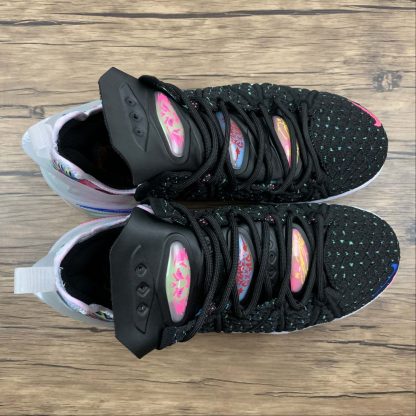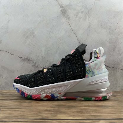 This offering of the LeBron 18 features a predominately Black knitted upper that’s contrasted with multicolored accents throughout. The tongue is branded with “James Gang” complete with a translucent heel piece, White midsole and colorful outsole.