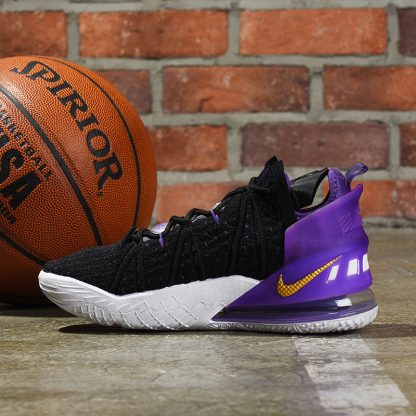 Dressed in a Black, Metallic Gold, Court Purple, and White color scheme. This Nike LeBron 18 features a Black Knitposite 2.0 upper with Purple thread and durable molded heel clip. Gold Swooshes on the toe and medial heel with “LeBron James” in the Lakers font printed on the insoles atop a full-length Air Zoom unit combined with a Max AIR unit in the heel completes the design.