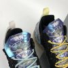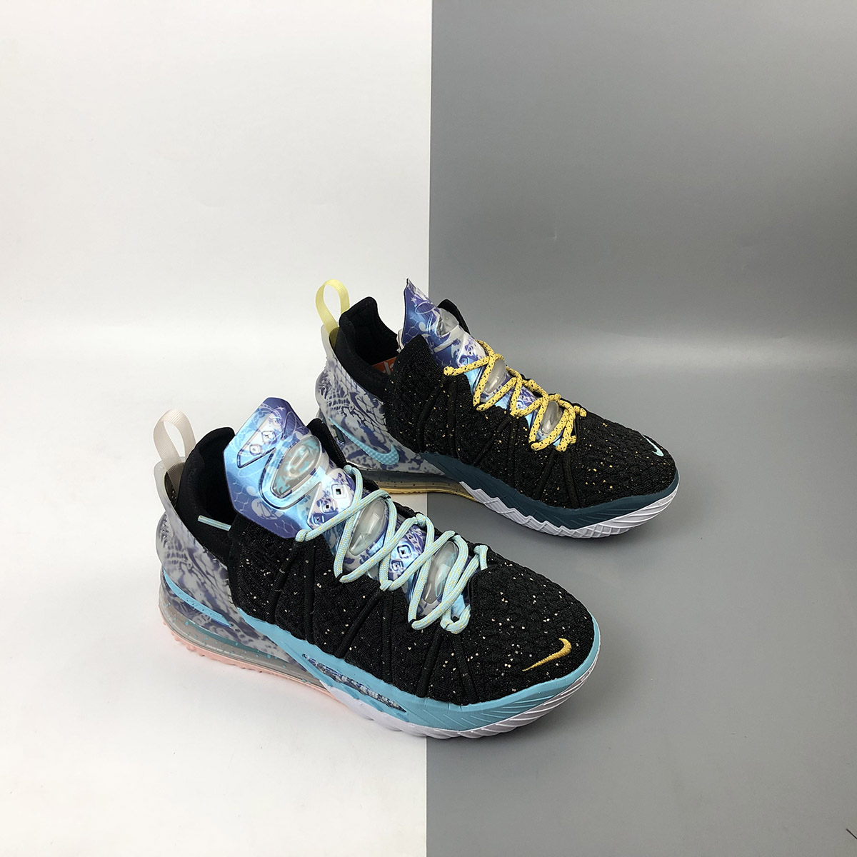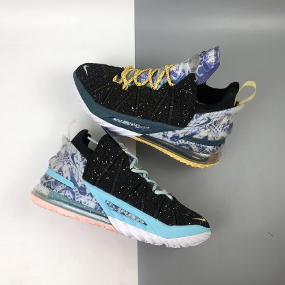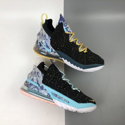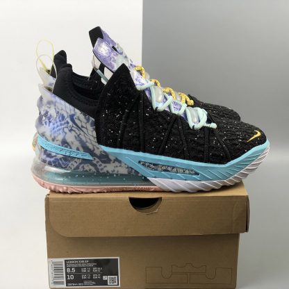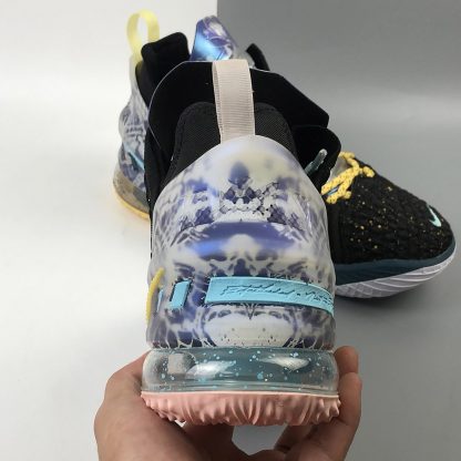 The reflection theme is expressed through slightly altered colors on the left and right shoe, with variations on the sole, logos, heel tab and laces. Iconography representing his 17 seasons to date creates unique collages that appear as graphics on the heel, tongue and sockliner. With a lightweight Black Knitposite 2.0 upper, durable molded heel clip, new Air system in the tongue and a full-length Air Zoom unit combined with a Max AIR unit in the heel, this game-changing design elevates the LeBron signature line to the next level.