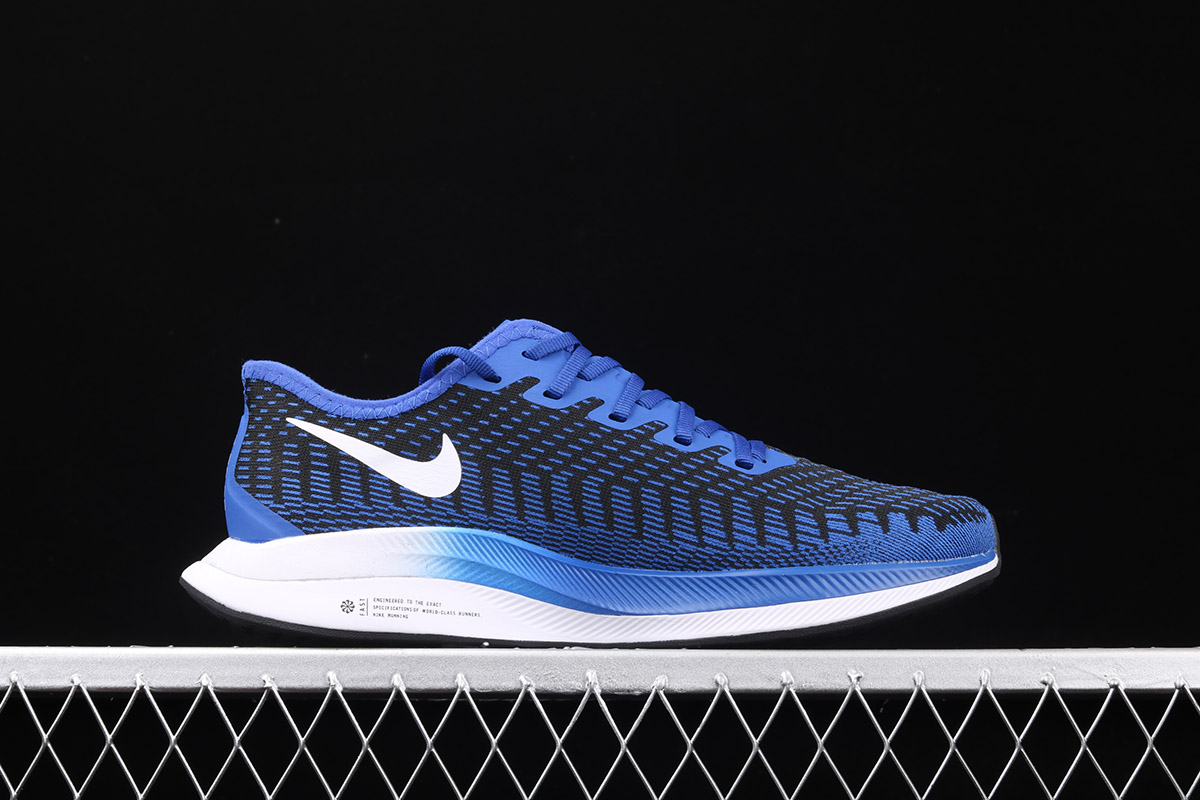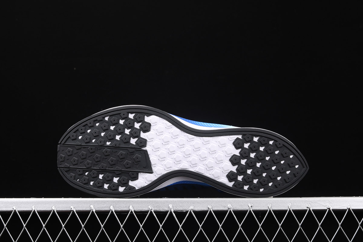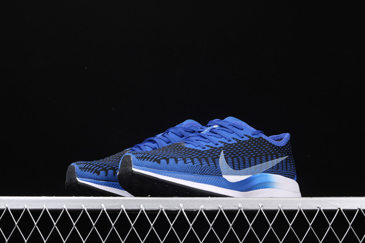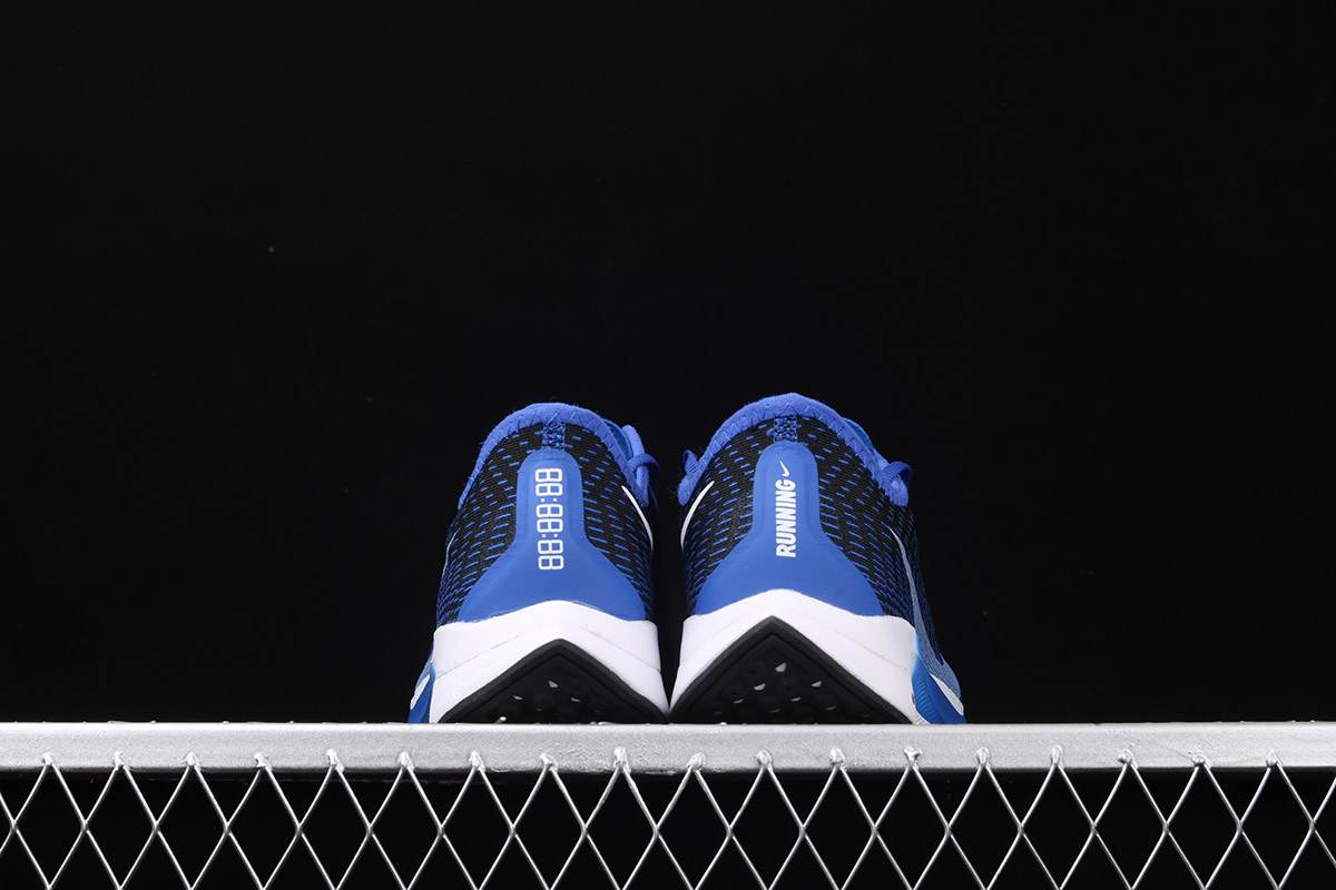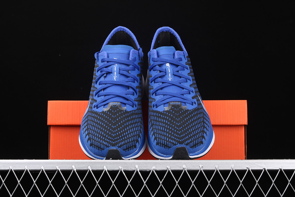 The shoe is known for its featherlight weight, which is made of lofted mesh that’s lighter than its predecessor. It features a Black base with Blue detailing and large White Swoosh that dips down onto the midsole. The signature Nike ZoomX foam cushioning completes the design.