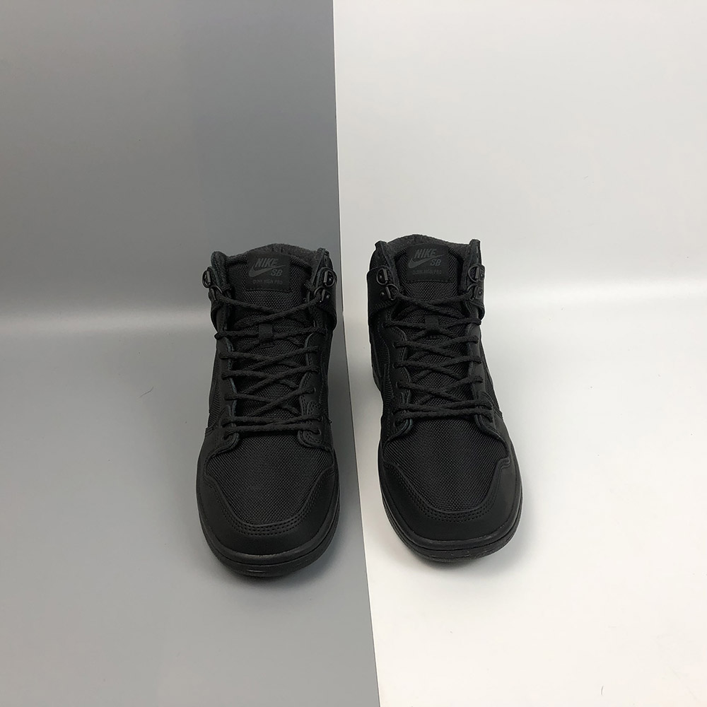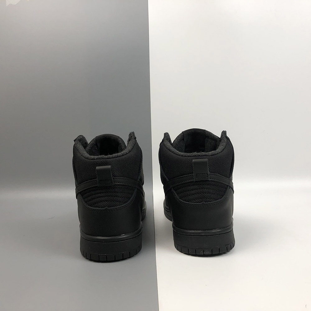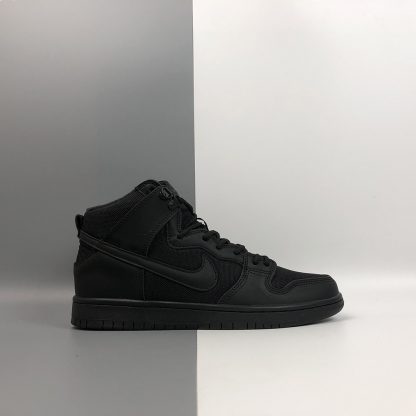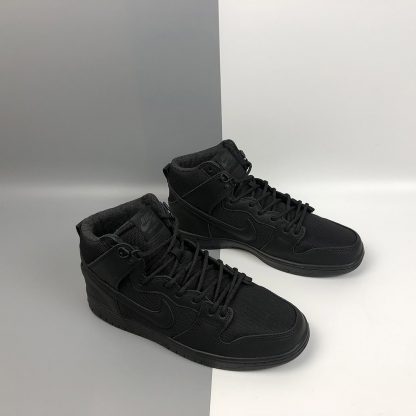 Dressed in a Triple Black color scheme. This Nike SB Dunk High comes with weather resistant material with a combination of suede and ballistic nylon are combined with a warm wool sock liner.