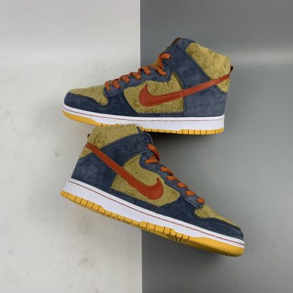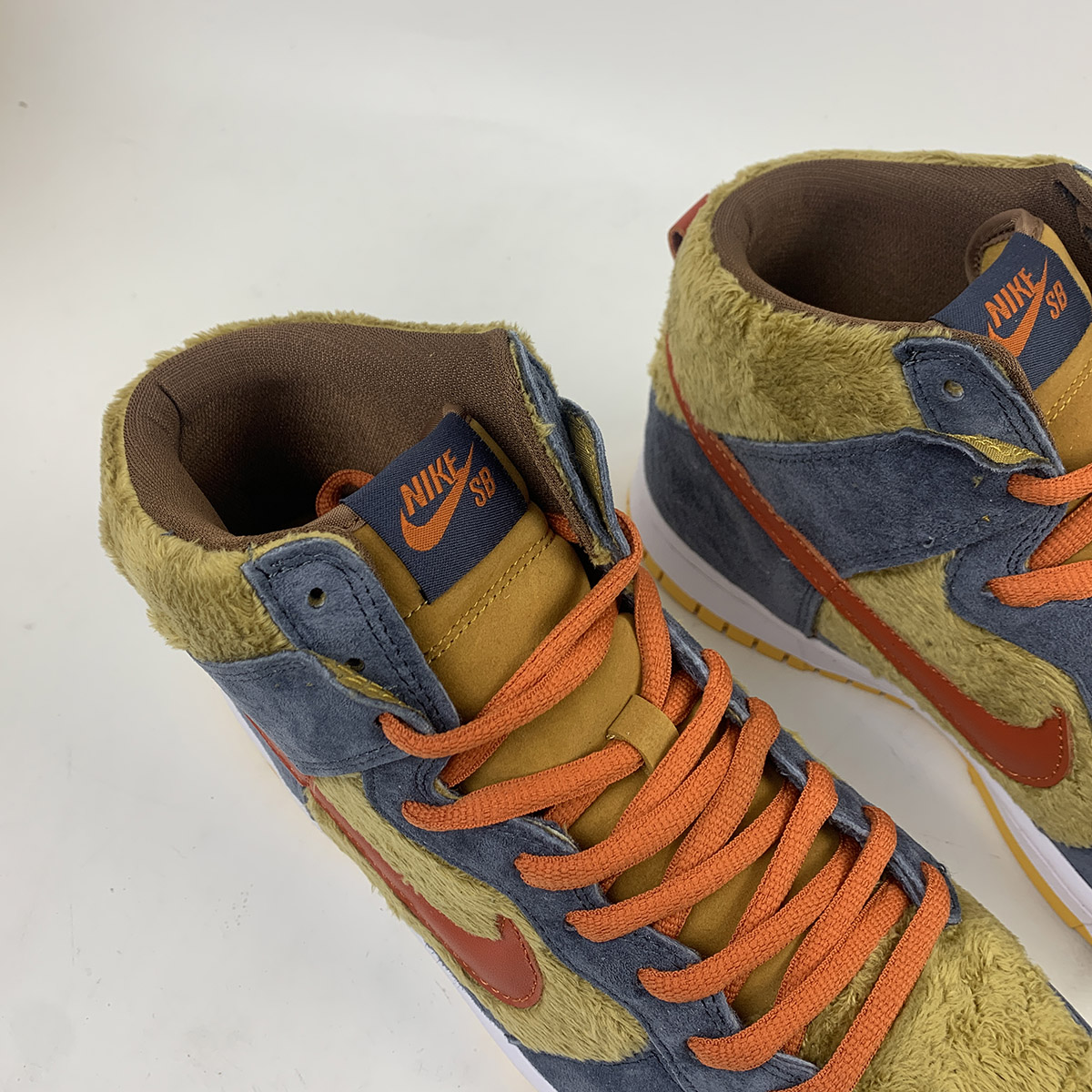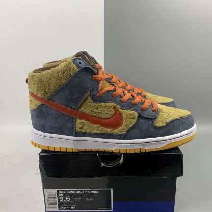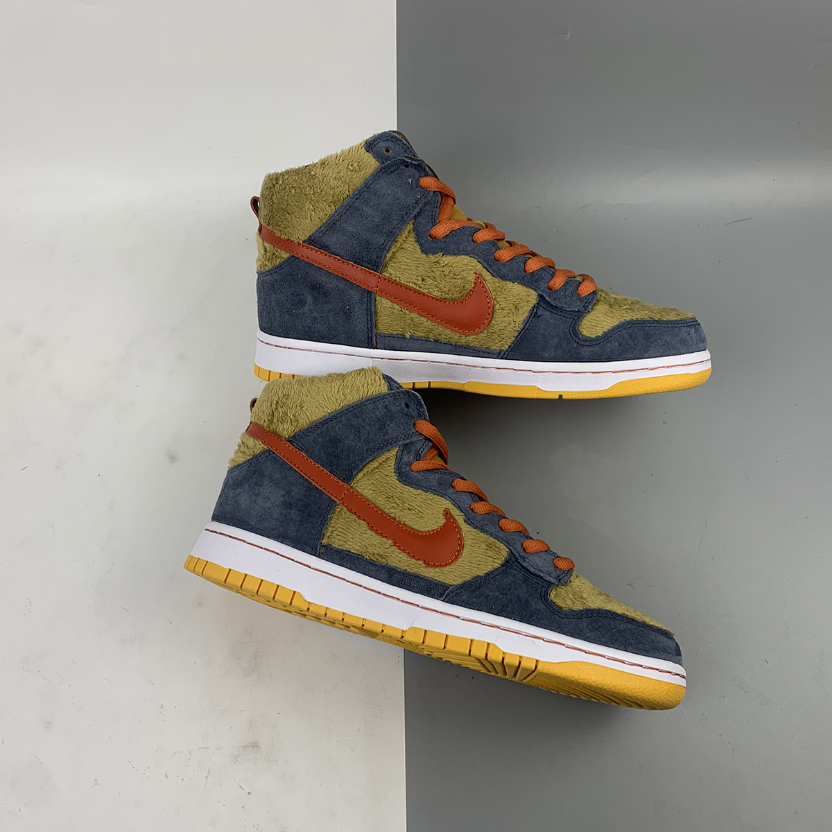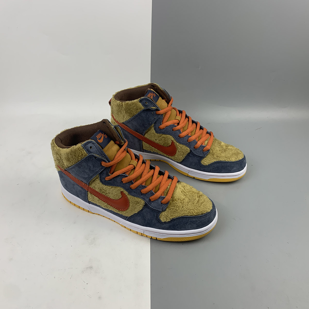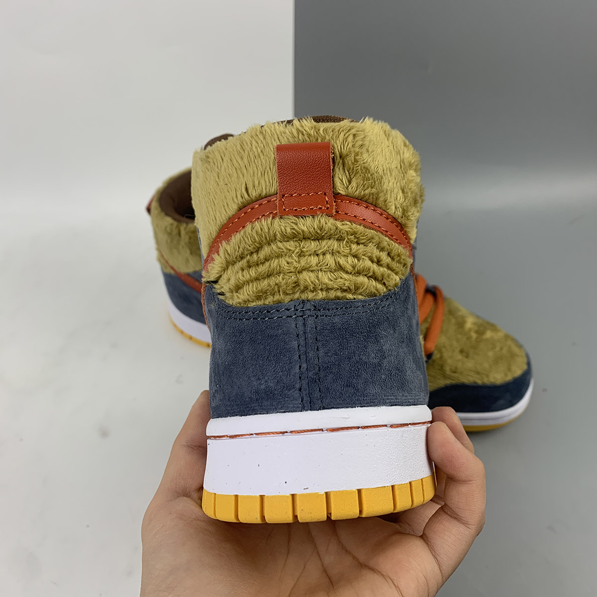 The third sneaker of the Three Bears Pack, the Three Bears High or Papa Bears feature a subtler colorway than the other two, although still maintaining the pack’s fuzzy feel. The shoe contains a reddish-orange swoosh on dark blue suede, with the signature bear fur. Like the two other sneakers, the Papa Bears were released alongside matching Three Bears Bearbrick toys produced by Kubrick based in Japan. A picture of the Bearbrick toy can be seen on the insole of the shoe