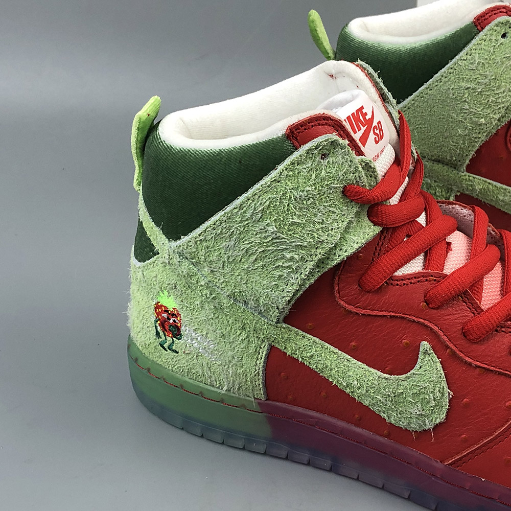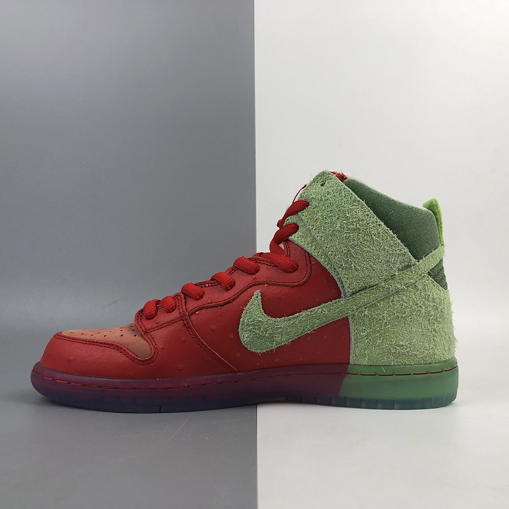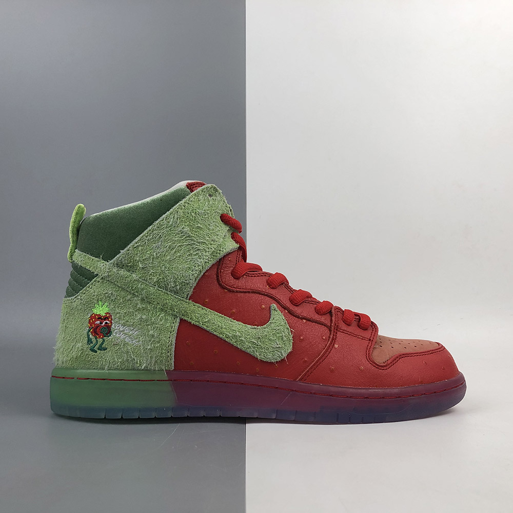 Its name is a nod to a popular strain of marijuana. This Nike SB Dunk High features a textured Red upper with Green hairy suede overlays to look like an actual strawberry. A coughing strawberry logo on the heels and insoles atop a translucent outsole completes the design.