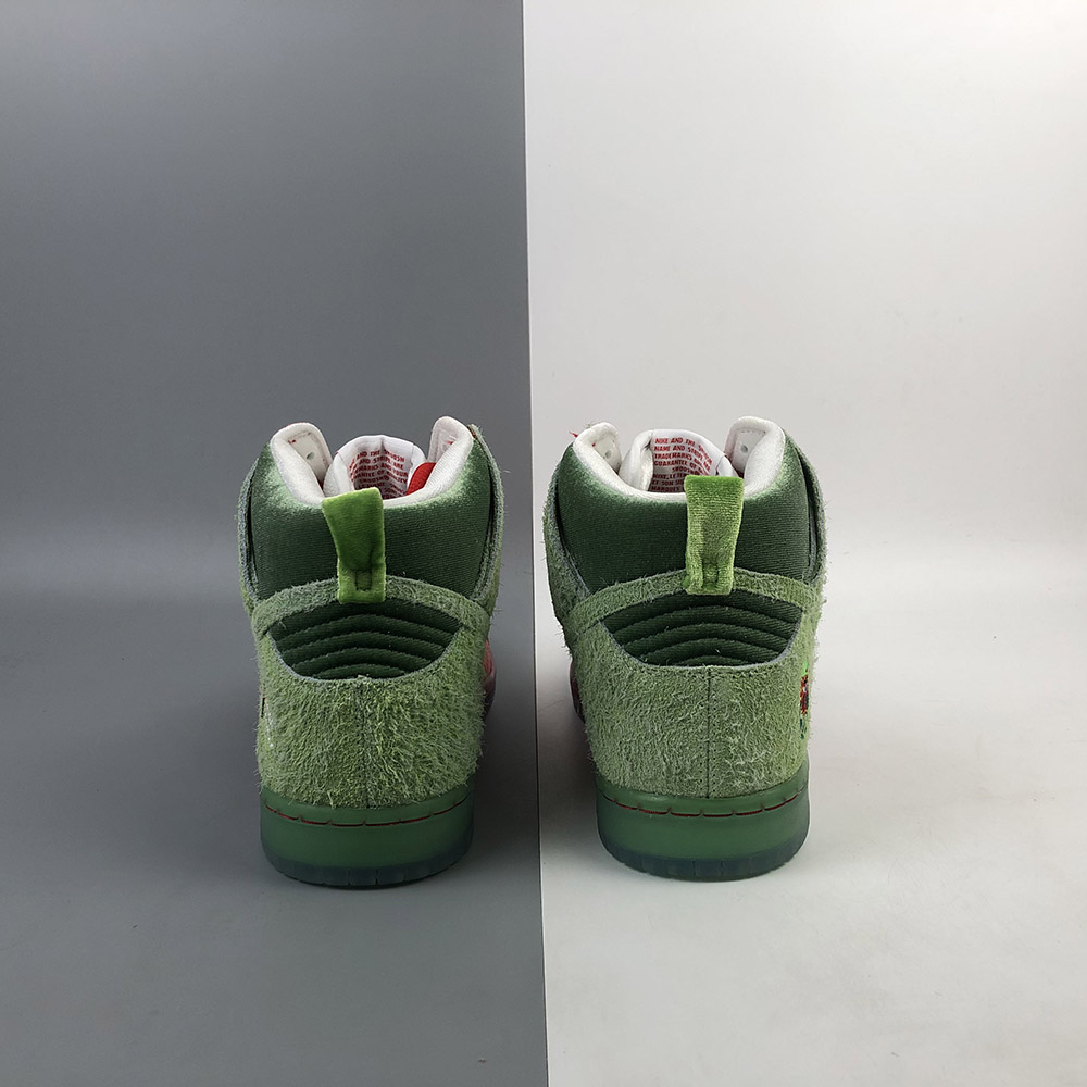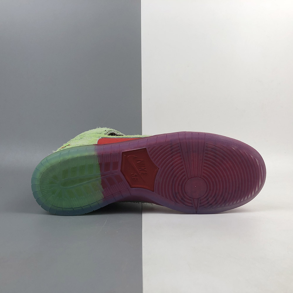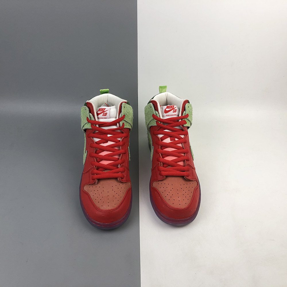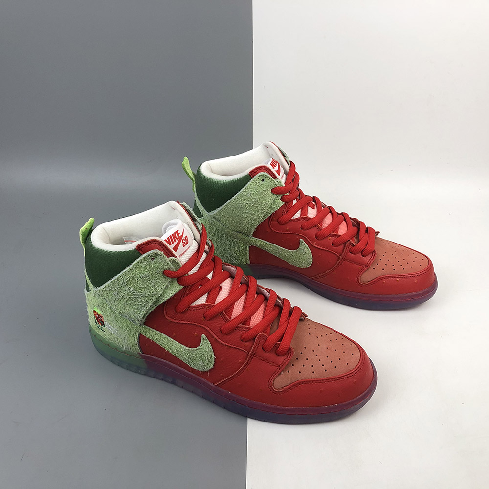 Its name is a nod to a popular strain of marijuana. This Nike SB Dunk High features a textured Red upper with Green hairy suede overlays to look like an actual strawberry. A coughing strawberry logo on the heels and insoles atop a translucent outsole completes the design.