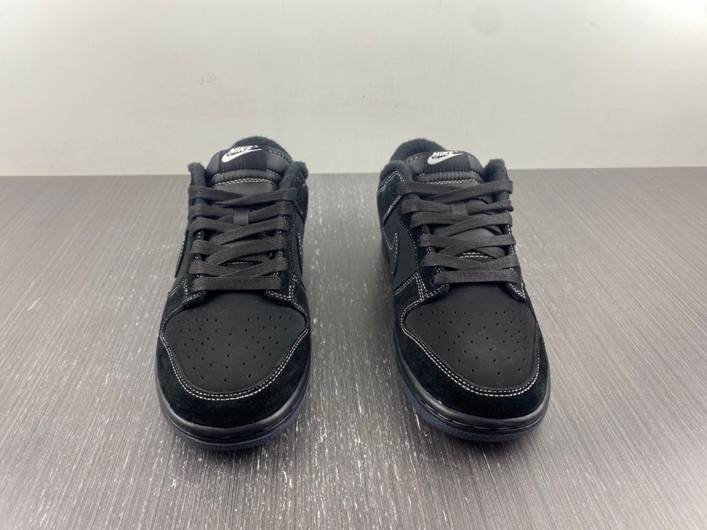 A stealthy black-on-black look hits the Nike SB Dunk Low Pro. This all-black Dunk features a full suede upper and an all-black midsole and outsole. Even the extra laces are black.