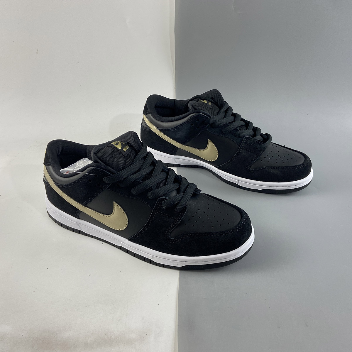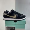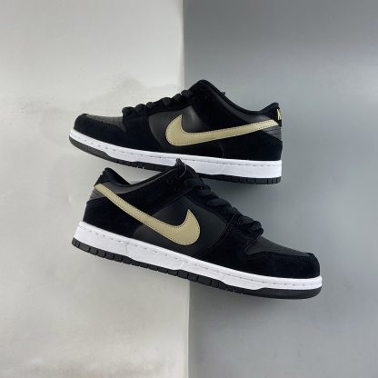 Dressed in a Black, Metallic Gold, and White color scheme. This Nike SB Dunk Low features a Black leather underlay with matching nubuck on its overlay. Metallic Gold Swoosh logos, tongue tabs, back heel tab and insoles atop a White midsole and Black rubber outsole completes the design.