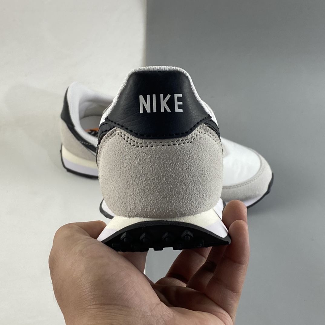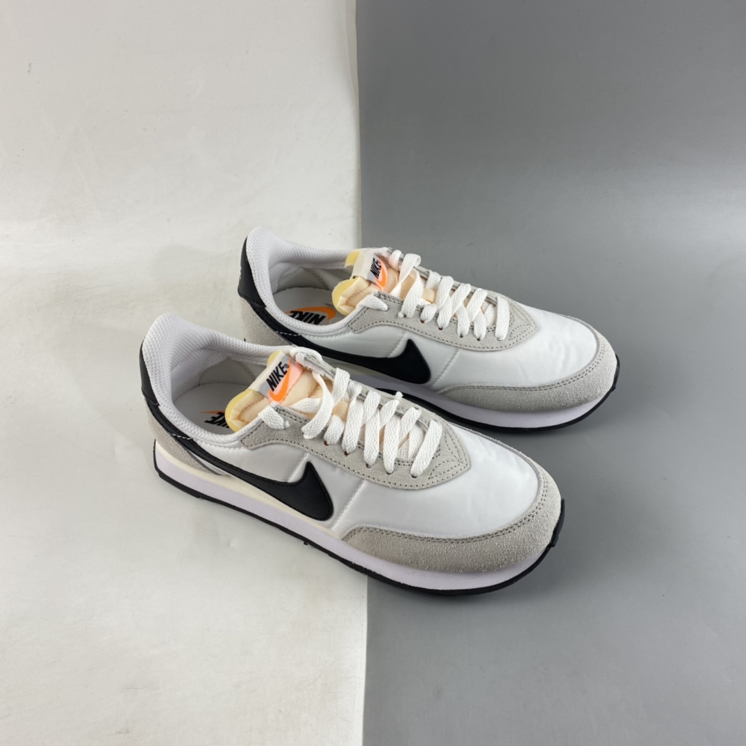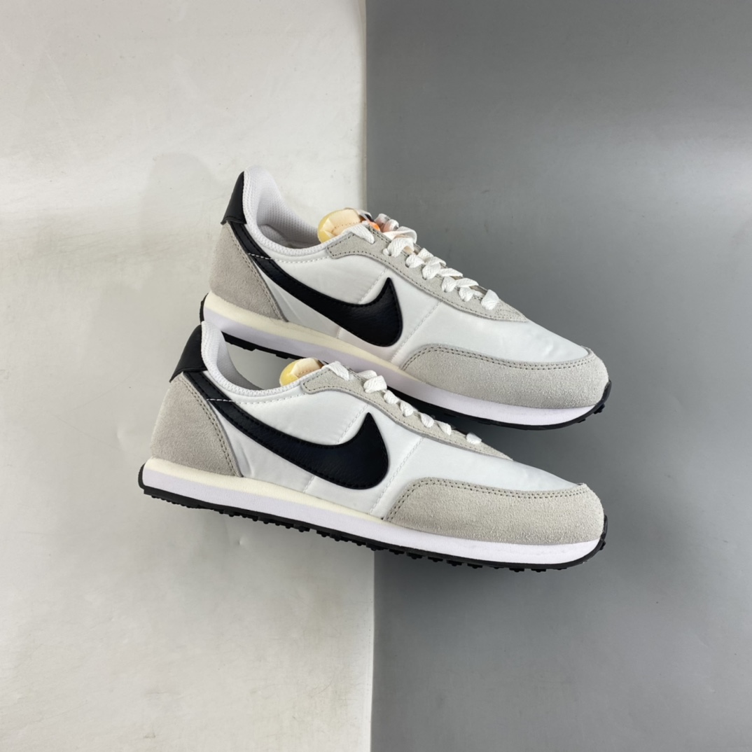 This offering of the Nike Waffle Trainer features a White nylon upper with suede overlays on the eyestays, forefoot, and heel. White continues on the laces and midsole paired with Black leather Swooshes and heels. Finishing off the design is its signature vintage-styled padded tongues, Orange Swooshes on the tongues and insoles atop a Black waffle rubber outsole.