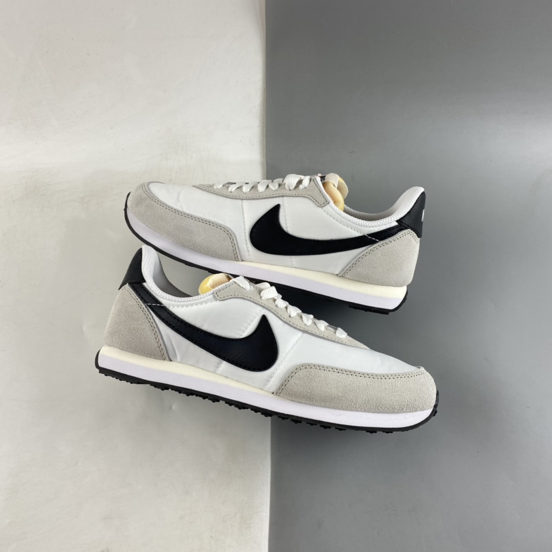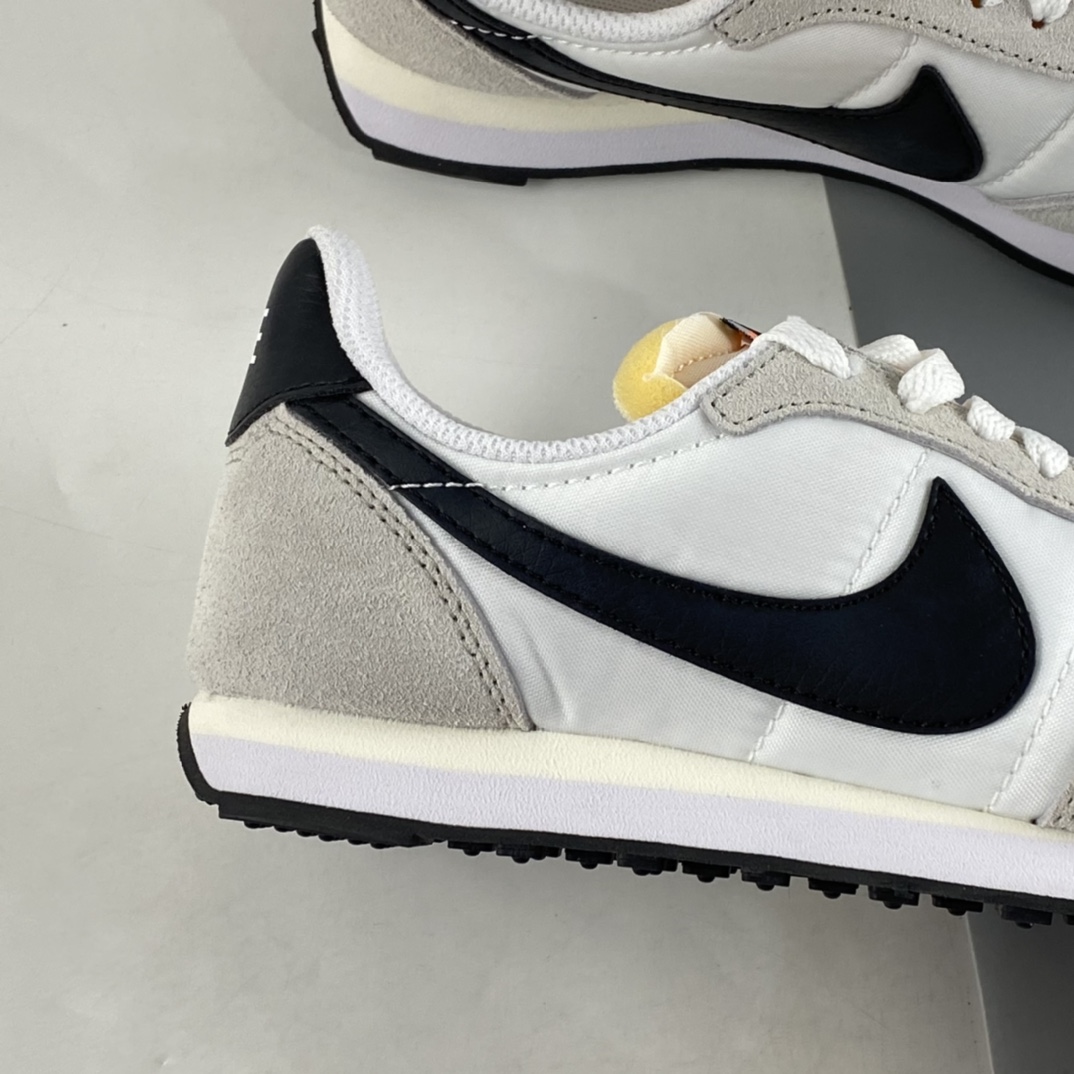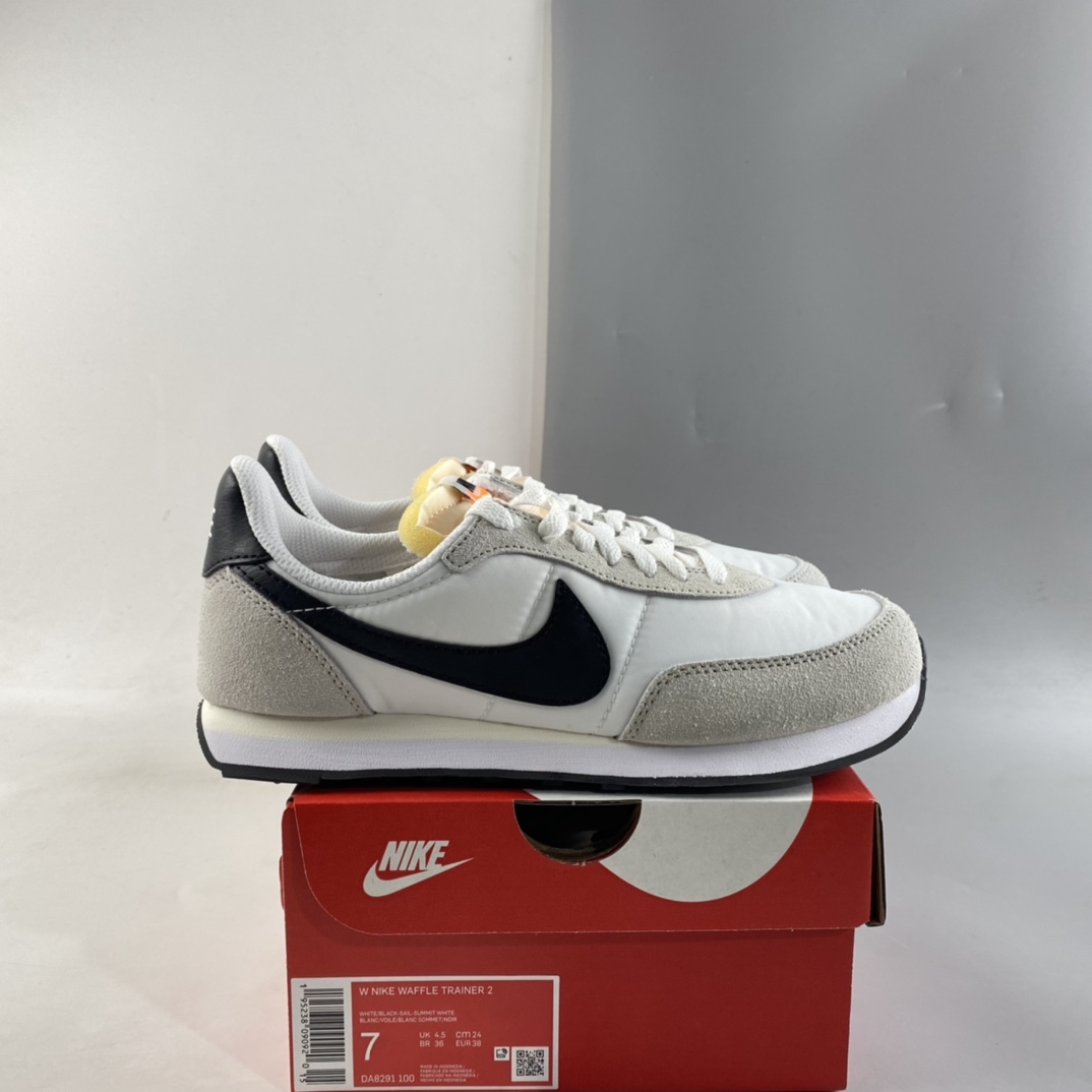 This offering of the Nike Waffle Trainer features a White nylon upper with suede overlays on the eyestays, forefoot, and heel. White continues on the laces and midsole paired with Black leather Swooshes and heels. Finishing off the design is its signature vintage-styled padded tongues, Orange Swooshes on the tongues and insoles atop a Black waffle rubber outsole.