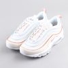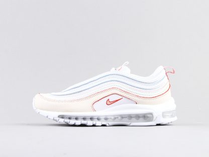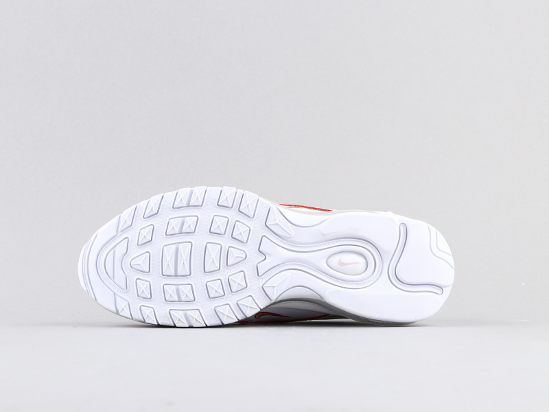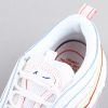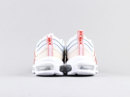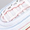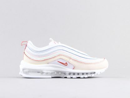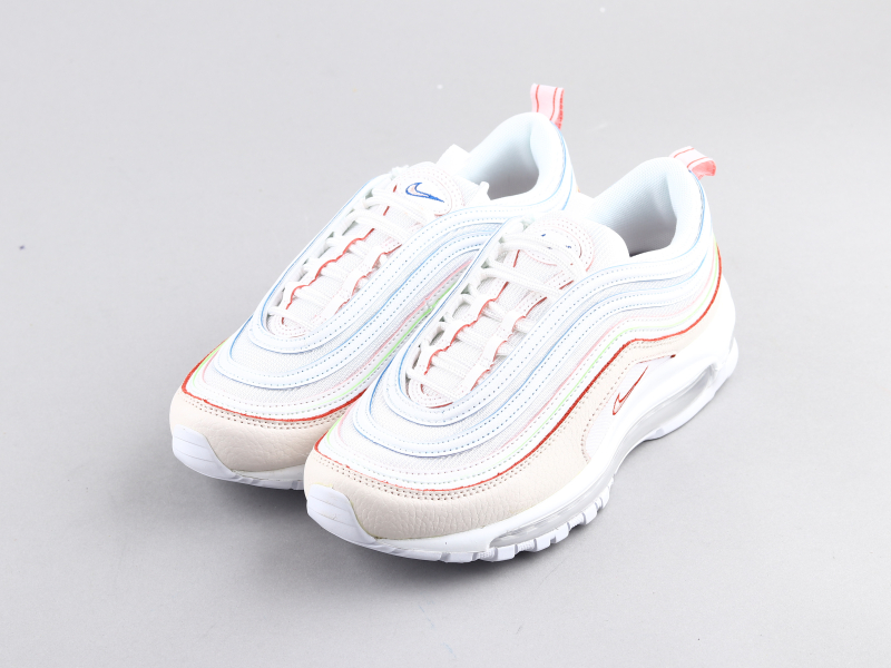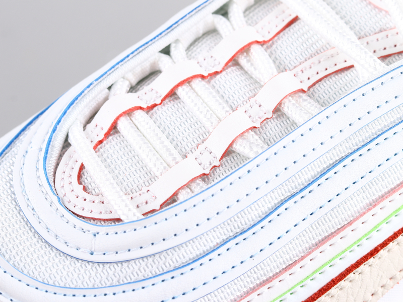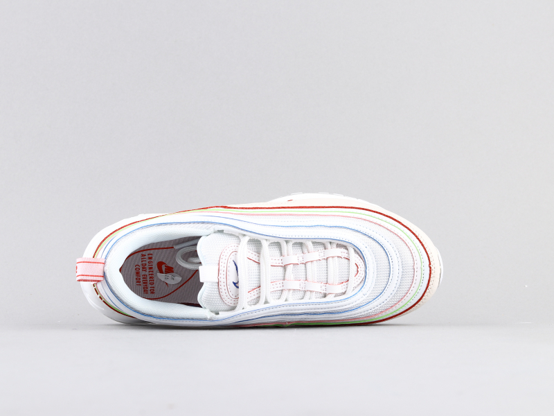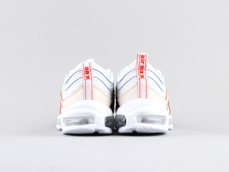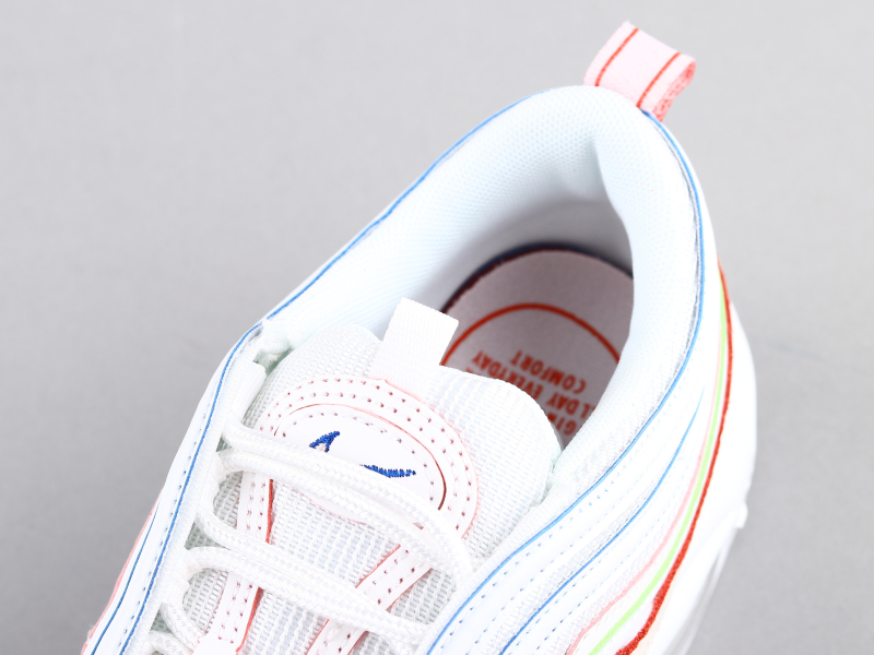 Red, green, pink, blue and orange are the colours used for the edges of the material along the lines of these AM97’s, a true rainbow appearance. A very clever way that Nike have incorporated colour, not on the outsides, just on the seams. The colour is finished off with a red outlined mini swoosh on the sides and a red/pink pull tab at the back with Air Max branding.