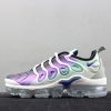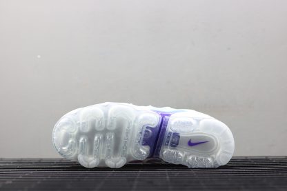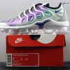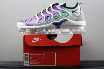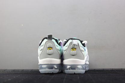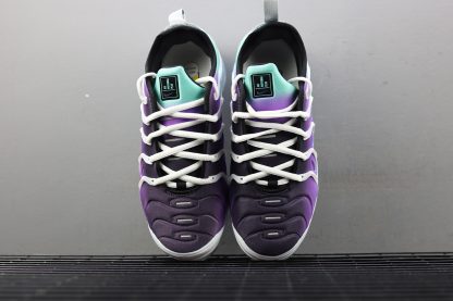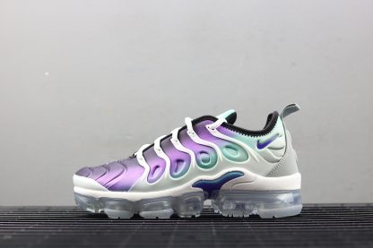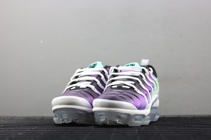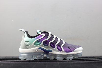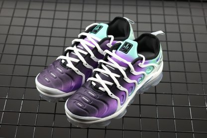 Dressed in a White, Fierce Purple, Aurora Green and Black color scheme. This “Grape” iteration of the Nike VaporMax Plus comes in Aqua tones throughout the upper paired with a White cage overlay. 3M Reflective detailing on the tongues adds for a signature finish.