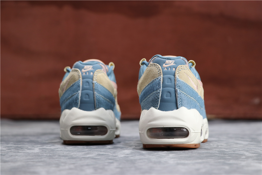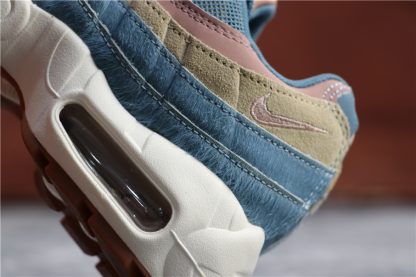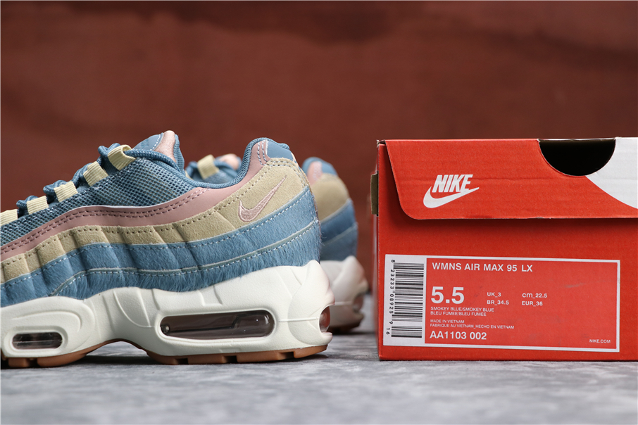 The iconic construct of the AM95 is retained for the ‘Smokey Blue’ Pack. That includes the wavy design across the upper where overlapping layers of nylon, suede and pony fur come together.