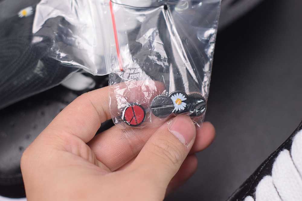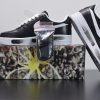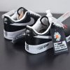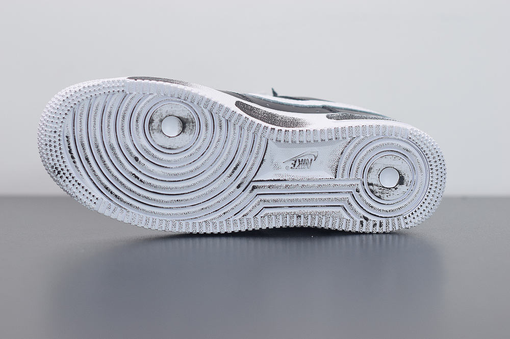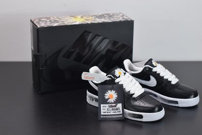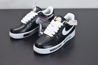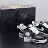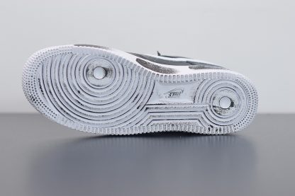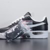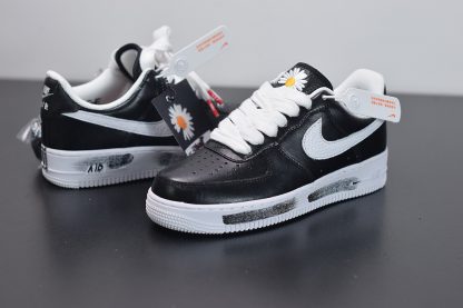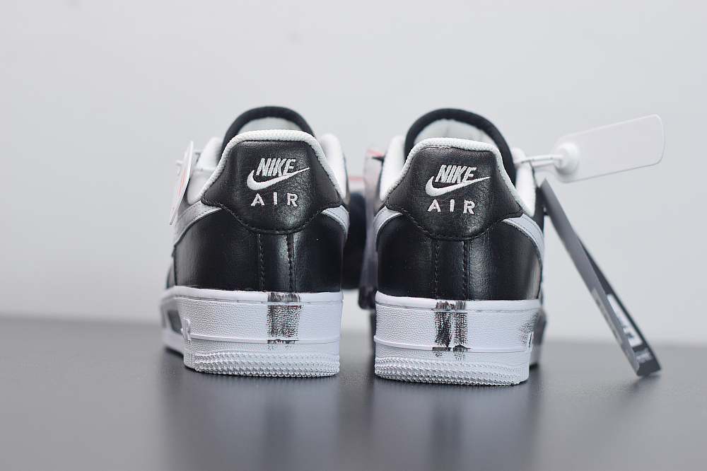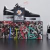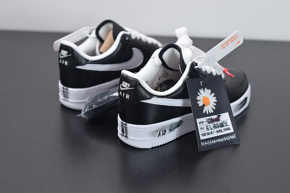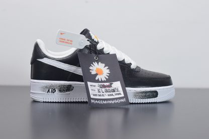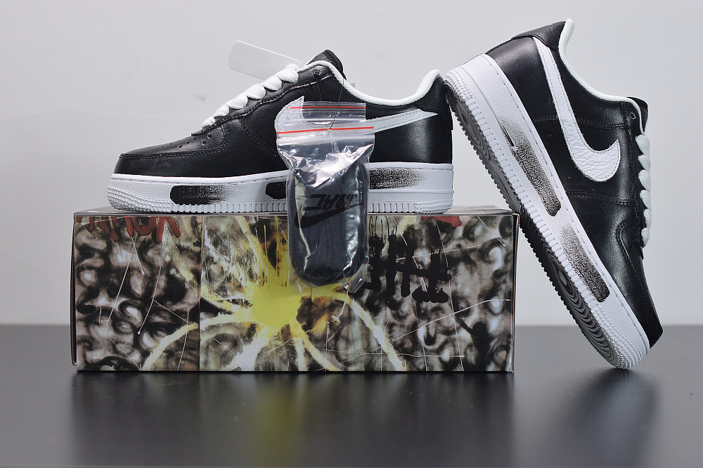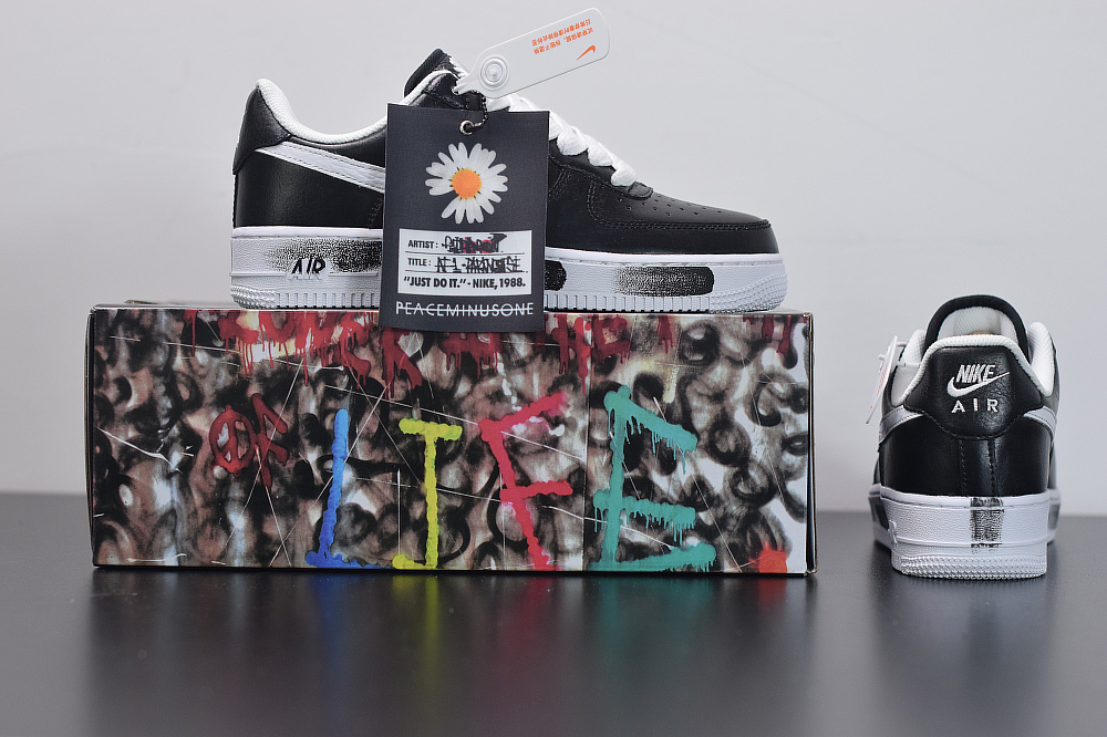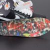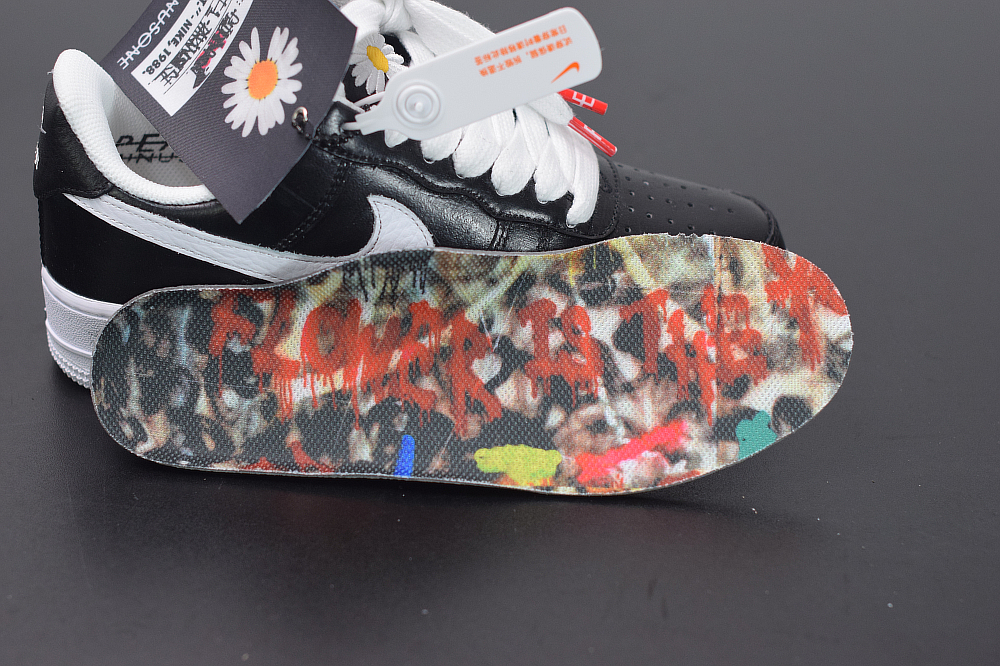 Getting a better look at the low cut sneaker we see that the premium leather upper features a cracked black exterior that reveals hits of color hidden under. Contrasts comes in the form of white Swoosh branding, embroidered daisy motifs at the tongue, branded thick laces and a white lining. We also get a look at the printed insoles which express a graffiti-inspired print centered around a large daisy motif and dripping text. Finally, the haphazardly applied strokes of black paint not only appear on the side of the contrasting AF1 sole units but also on the bottom.