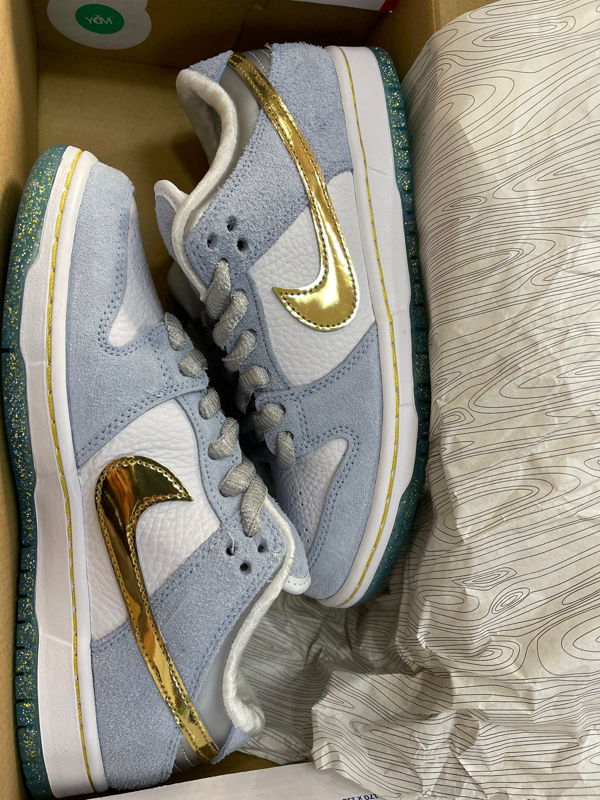 This Nike SB Dunk Low comes dressed in a White, Psychic Blue and Metallic Gold color combination. Utilizing White leather on the base while Blue suede lands on the overlays. Following we have Metallic Gold applied to the Swoosh logo and stitching on the midsole and Silver on the ankle. Other highlights includes Sean Cliver’s art on the insole and a translucent outsole with glitter details.