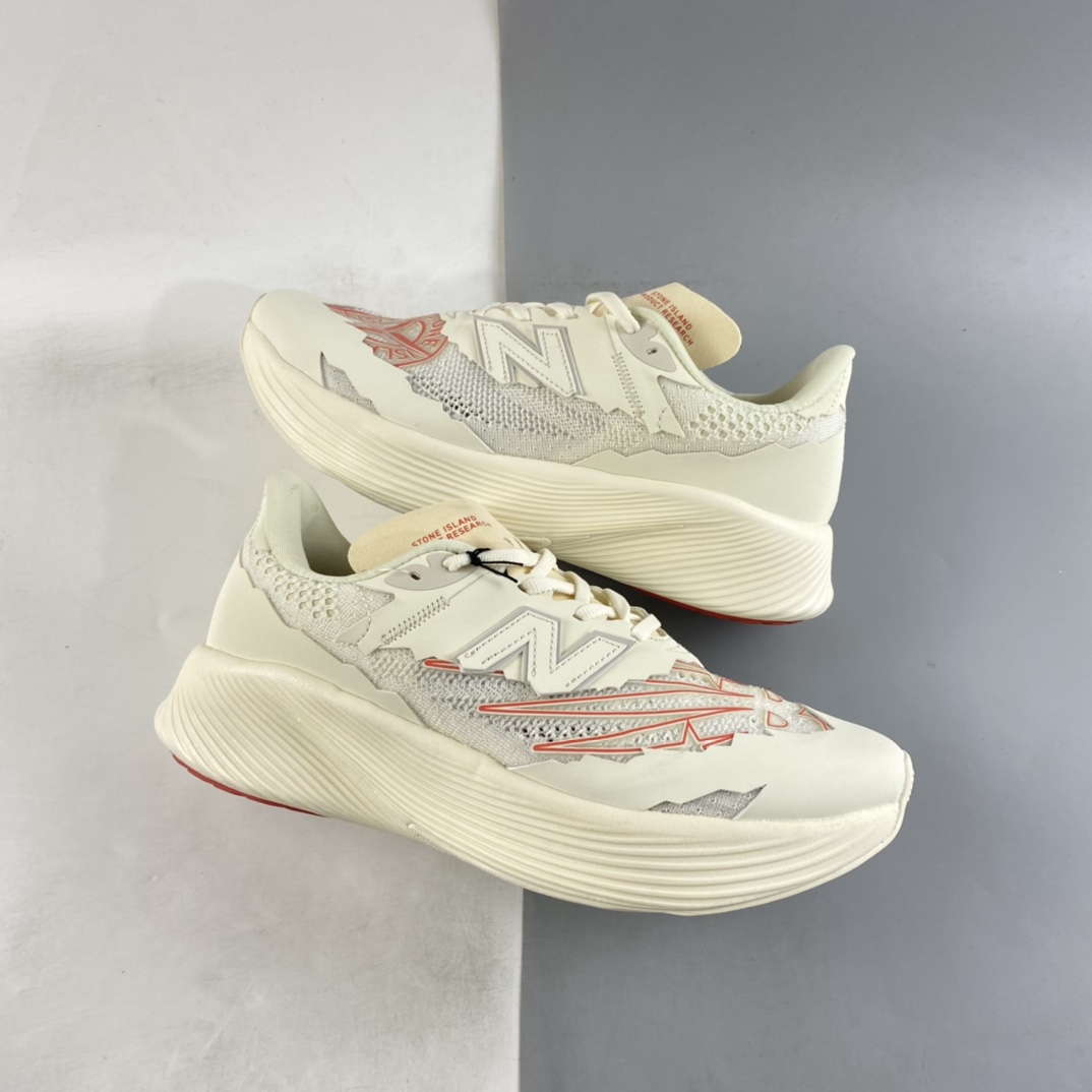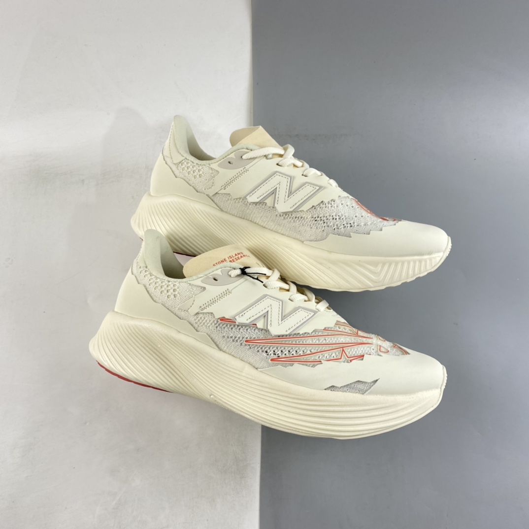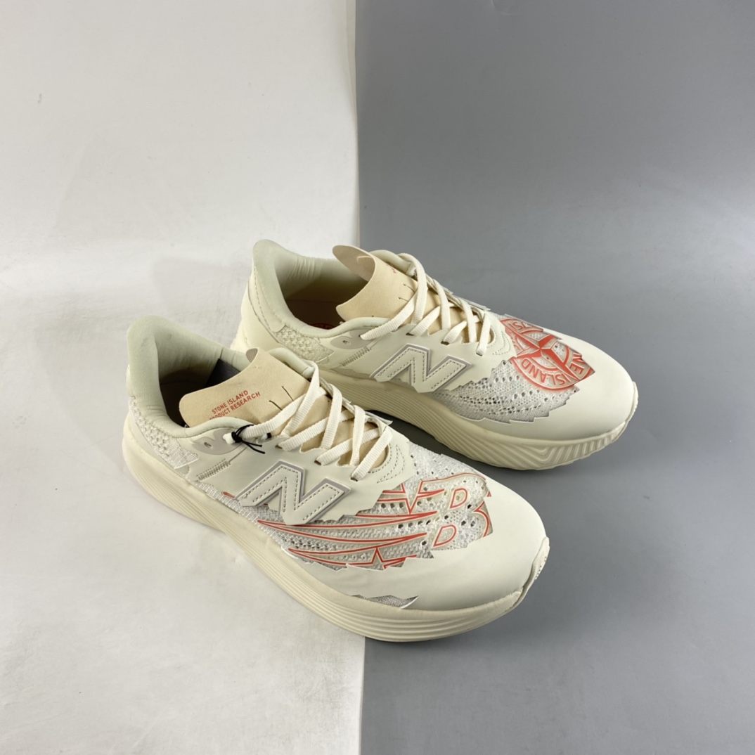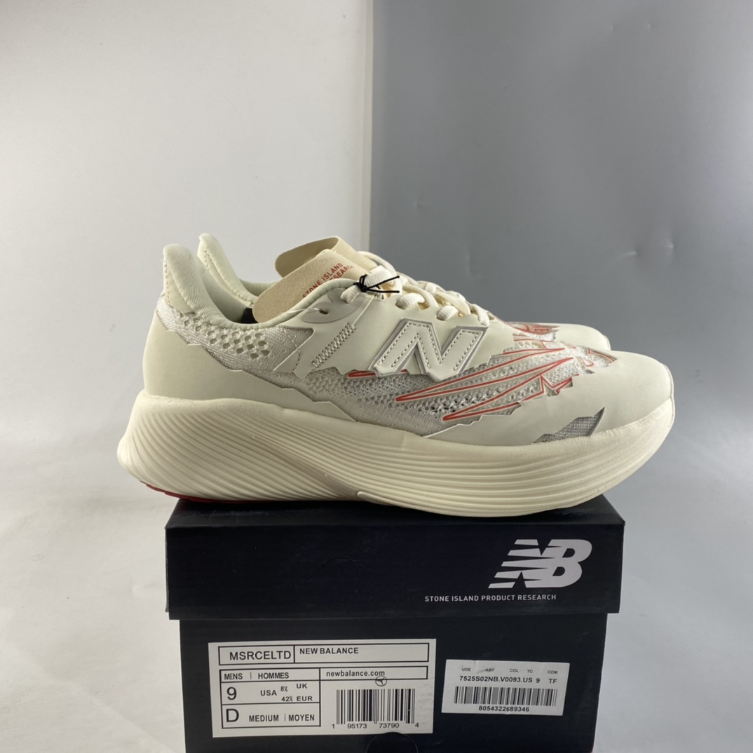 The RC Elite is known for its propulsive FuelCell cushioning system and a full-length energy-returning carbon fibre plate. However, with this pair, the model is refashioned to reflect the innovative energy of the brands’ collaboration. The entire upper looks like the traditional overlays were torn out to reveal the breathable lightweight 3D screen printed knit upper with engineered mesh, making it super breathable and race-ready. On the right forefoot is the modern NB racing logo in white and orange while the left forefoot features the compass logo of Stone Island.