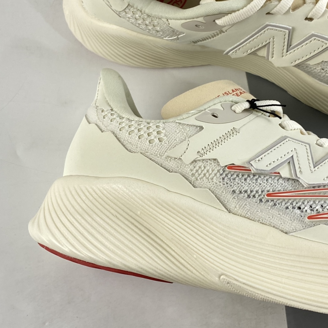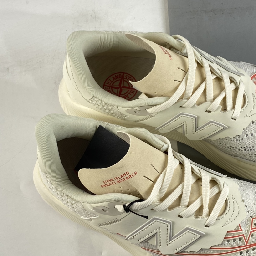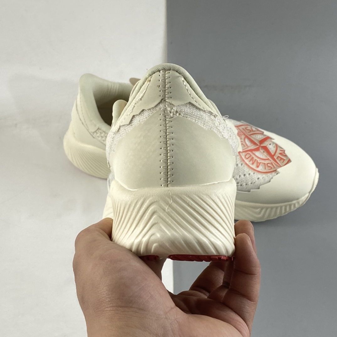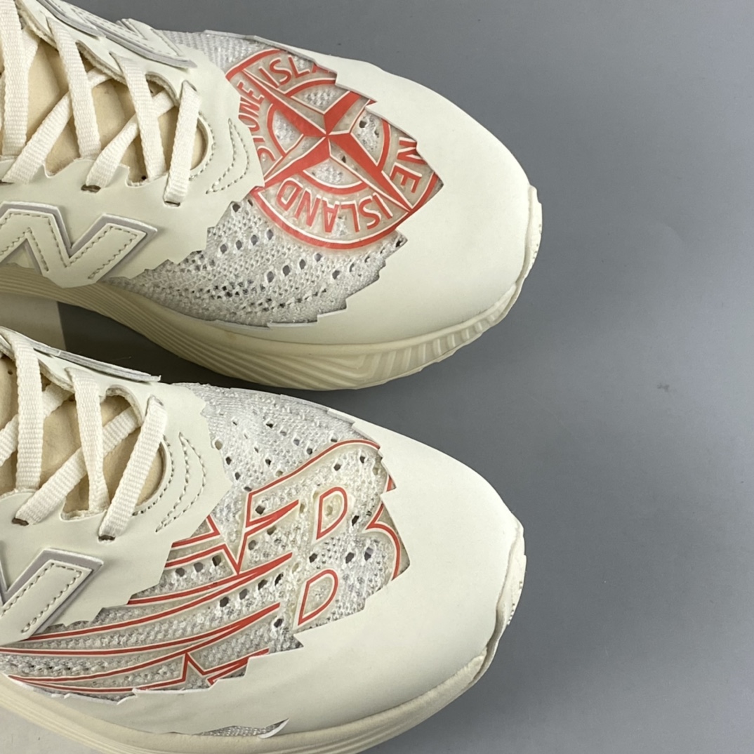 The RC Elite is known for its propulsive FuelCell cushioning system and a full-length energy-returning carbon fibre plate. However, with this pair, the model is refashioned to reflect the innovative energy of the brands’ collaboration. The entire upper looks like the traditional overlays were torn out to reveal the breathable lightweight 3D screen printed knit upper with engineered mesh, making it super breathable and race-ready. On the right forefoot is the modern NB racing logo in white and orange while the left forefoot features the compass logo of Stone Island.