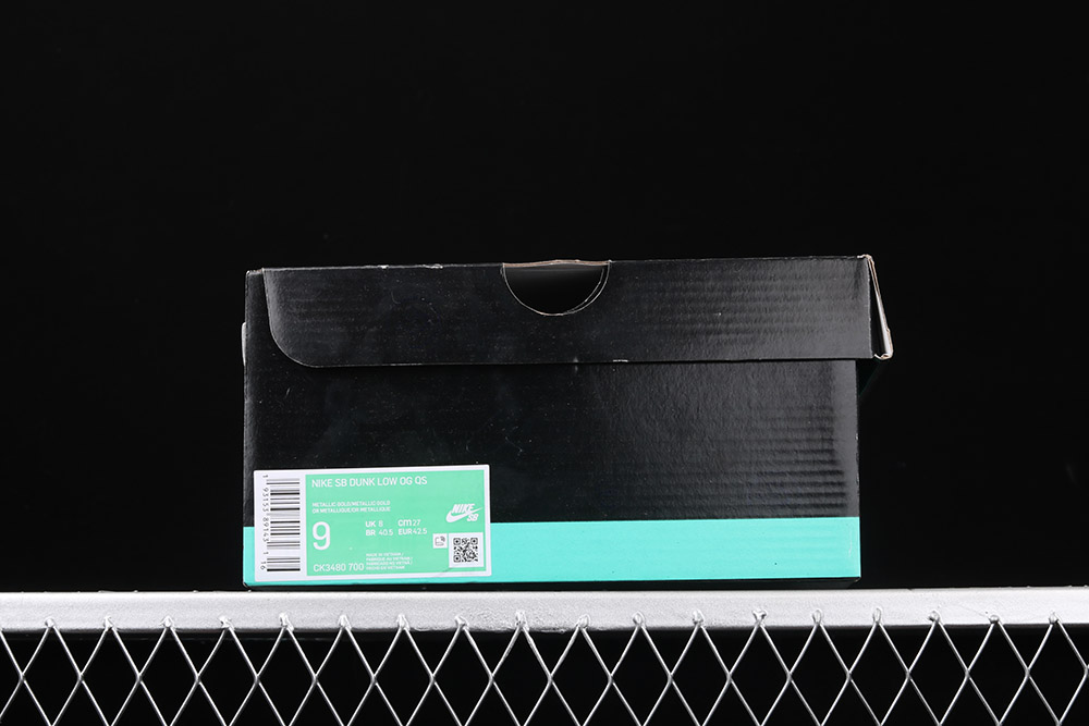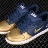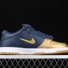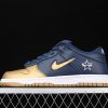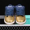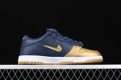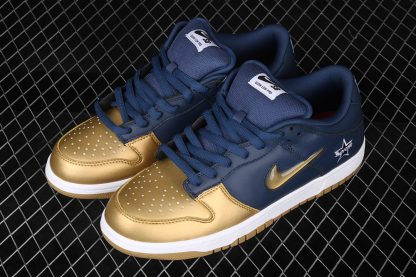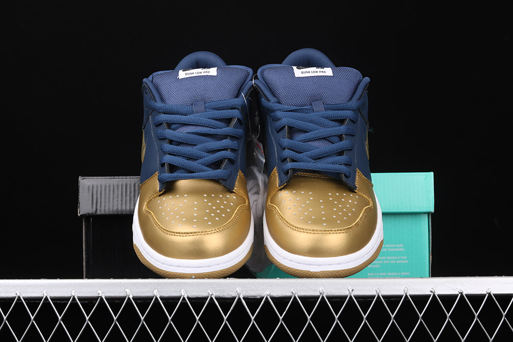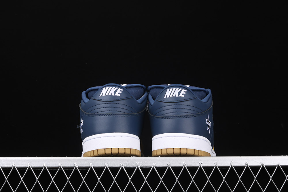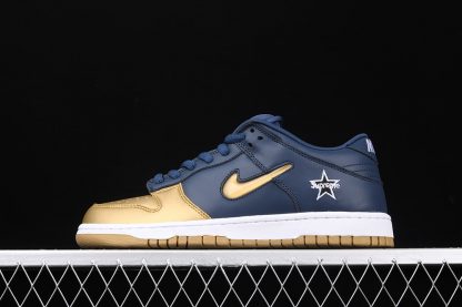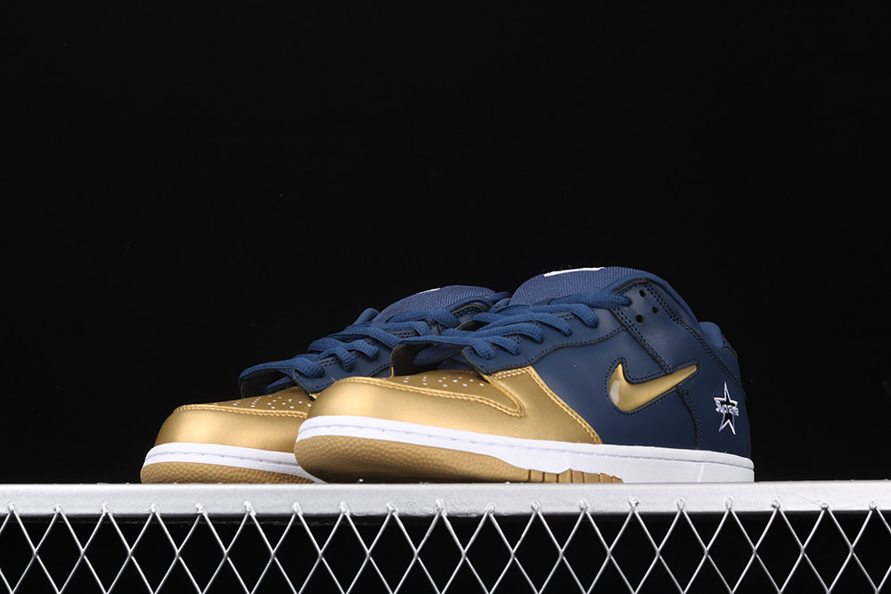 In collaboration between Nike SB and Supreme is a new Dunk Low boasting a navy leather upper that’s contrasted by a metallic gold toe panel, a Supreme star logo on the heel and jewel swoosh branding on the sides.