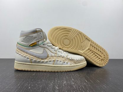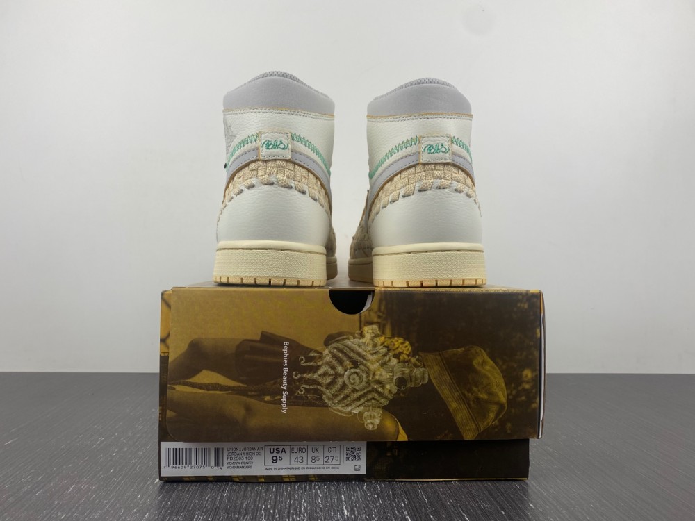 Dressed in a Sail, Wolf Grey, Muslin, Pale Vanilla, Kinetic Green, and University Gold color scheme. This offering of the Union x Air Jordan 1 High OG comes in an OG-styled “Neutral Grey” makeup constructed in a full leather build with woven detailing wrapping around the entire shoe. Other details includes Wolf Grey detailing on the Swooshes, collars, “Nike Air” tongue tags, and Wings. Union’s “UN/LA” signature tag on the lateral with exposed Green stitching and “BBS” embroidered on the heels nodding Union founder Chris Gibbs’ wife Beth and her Bephie’s Beauty Supply brand. A two-tone aged rubber sole completes the design. The shoe will also come with extra set of laces and housed in special packaging.