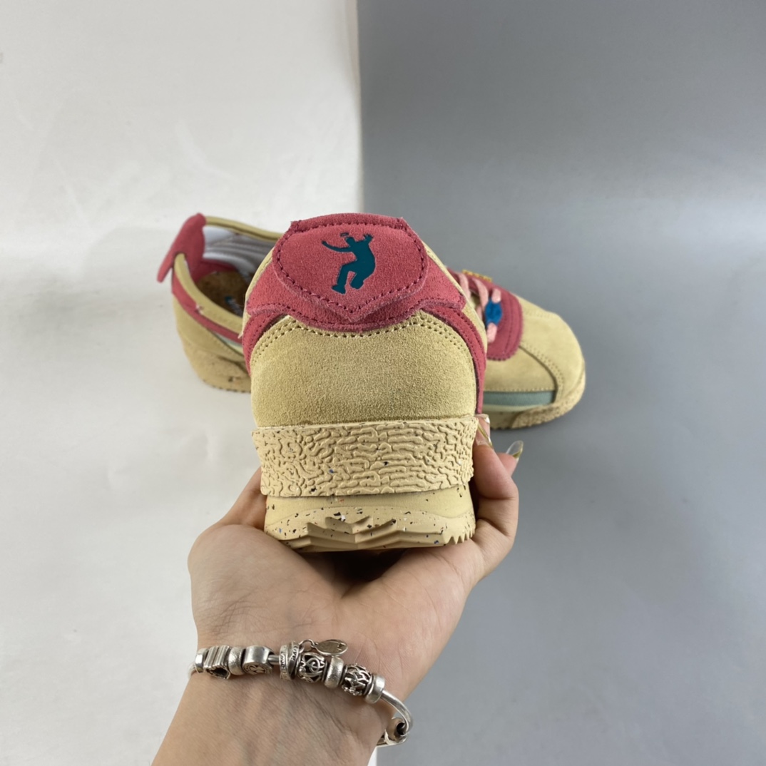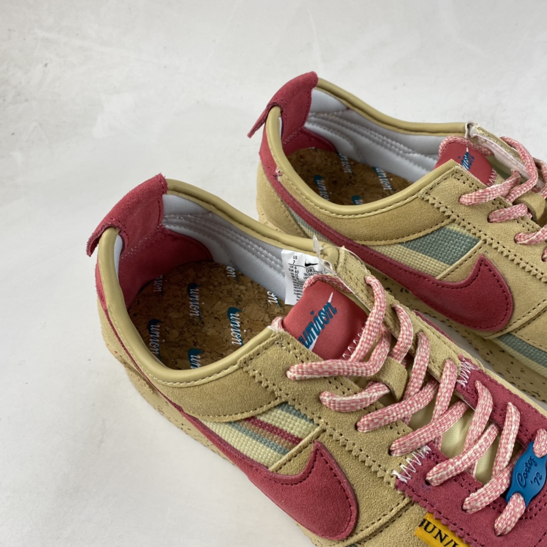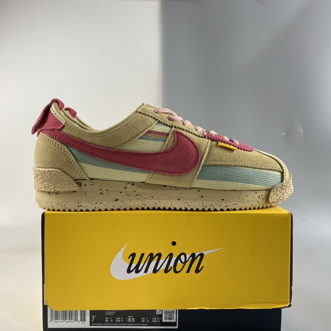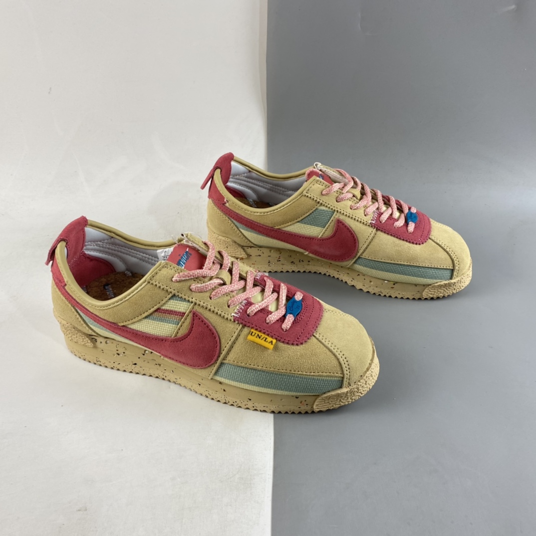 This colorway of the Union x Nike Cortez opts for a similar aesthetic as the Union x Air Jordan 4 Guava Ice. It starts off with a Tan hue all over the upper done in a textile canvas and suede construction. Vibrant pink detailing spotted on the lower eyestay, Swooshes, tongue tags, and heels add some nice vibrancy to the sneaker, while unique details include Union’s UN/LA tags on the lateral forefoot, their signature Frontman logo on the heel flaps that cover “NIKE” branding in White. Co-branded cork insoles, two-toned laces and dual branding on the tongue complete the look.