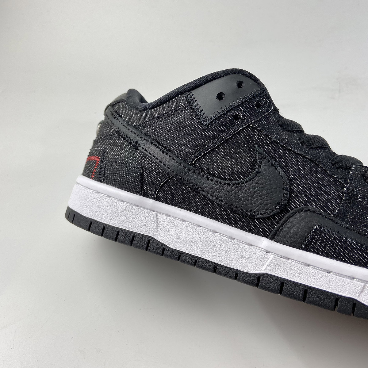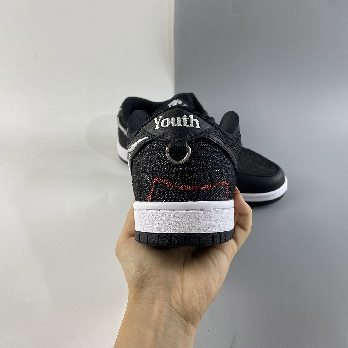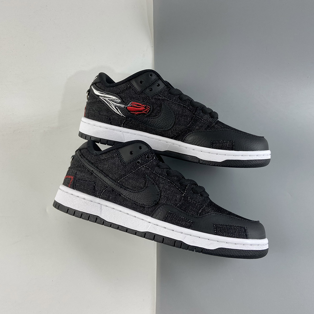 This Wasted Youth offering of the Nike SB Dunk Low comes with a patchwork design featuring a Black denim-like upper with leather overlays and square patches on the forefoot. Additional details includes a removable Swoosh on the lateral that exposes an outline of the logo in White, exposed Red stitching, a rose embroidered graphic on the medial, “Wasted” and “Youth” branded heels with metallic rings hanging below the heel tab. A White midsole atop a Black rubber outsole and text branded insoles completes the design.